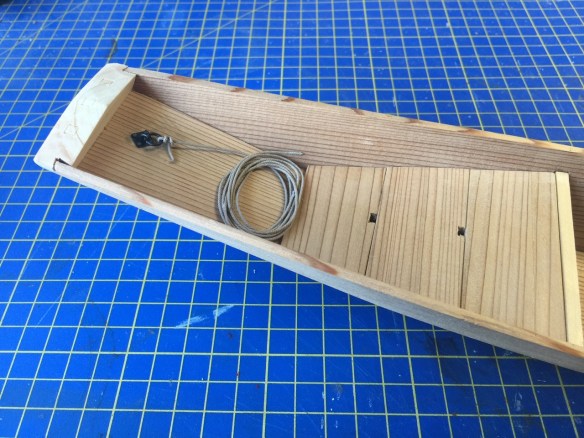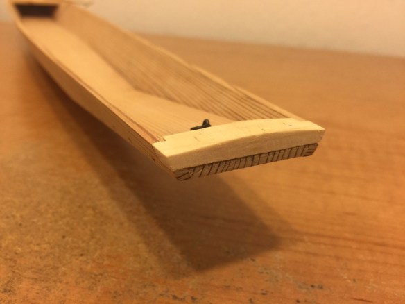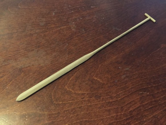 With the ringbolts in place, I also cut fake mortises in the end blocks and added blackened nails in the underside to simulate the bolts used on the actual boat. With that done, I turned to the kai, the T-handled paddle, that I had started months ago, but never finished. It actually didn’t take much work, as the hard part of shaping the paddle from a single piece of wood was already done. Basically, I had to finish the shaping the add the T-handle.