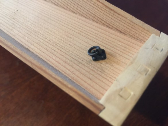 Yesterday, I finally got it in gear and did the metalwork for the ringbolts, or kan, as I recall from my Japanese taiko drumming and drum-making days, and that backing plate, whose name I can’t recall. I cut a square piece out of a sheet of brass and drilled holes at the corners for nails, and larger hole in the center for the ringbolt itself. The ringbolt parts, I made from 18-gauge copper wire, while the nails were brass nails I had on hand. These metal parts, I blackened using a metal toner. But, I ended up painting them anyway, as I thought the finish might be more durable during the assembly process.