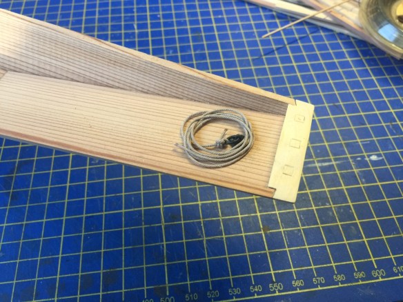 After I “finished” the model, I decided it might be nice to have a couple coils of rope tied to the ringbolts. I used .035″ beige line from Syren Ship Model Company. The line is very well defined, and it is pre-waxed. However, there is not enough wax for rope coils to hold their shape, so I ran the line through a cake of beeswax. This gives the line a little stickiness, allowing it to hold its shape better, but I still had to treat the free ends with a tiny amount of Alene’s Tacky Glue to help keep the coils intact.