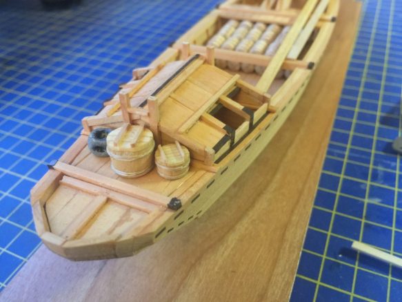 I will make it a point to take this project at least as far as the model in the Musee de la Marine, which is patterned strictly on the Paris drawings. To do this, I basically need to decide on the completion of the rudder mounting and to finishe andrig all 28 sculling oars, and add the sawari, the decorative tassel that hangs from the tip of the stem. On this, I’ll suggest a Summer target.