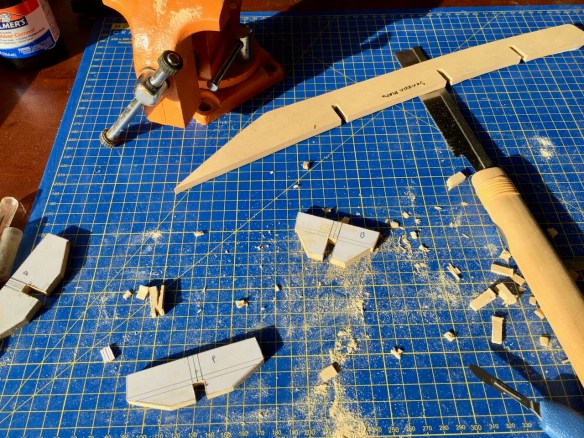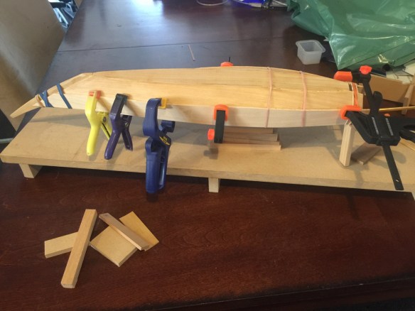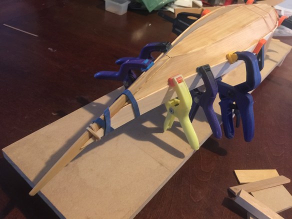 I don’t usually make the parts interlocking like I did on this. Normally, I just glue the crosswise formers to the central strong back. But, the interlocking pieces make for a stronger former assembly. It just takes more time to cut and fit the pieces together to make sure everything is straight and properly centered.