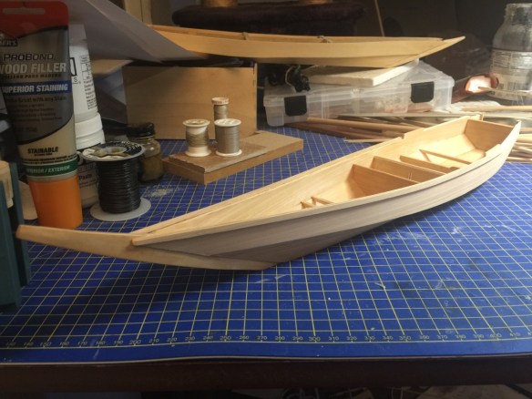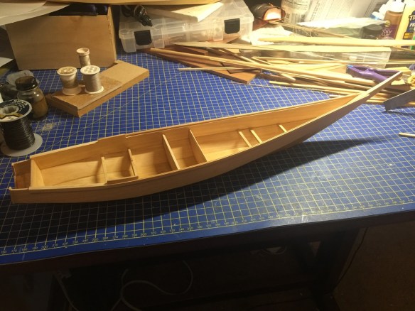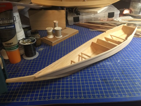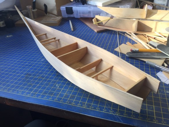 Yes, that’s the other wasen project sitting up on my work pile in the background. Again, more on that later. Next time, you should be able to see more of the interior progress with more beams, some supports for deck planking, splash board details, etc. But, the big challenge will be all the decorative features. I suppose I’ll try to create some kind of decals for the painted artwork. I don’t think I’ll attempt painting all the fine details at this scale. But, it is making me consider modeling this some day at 1/10-scale.