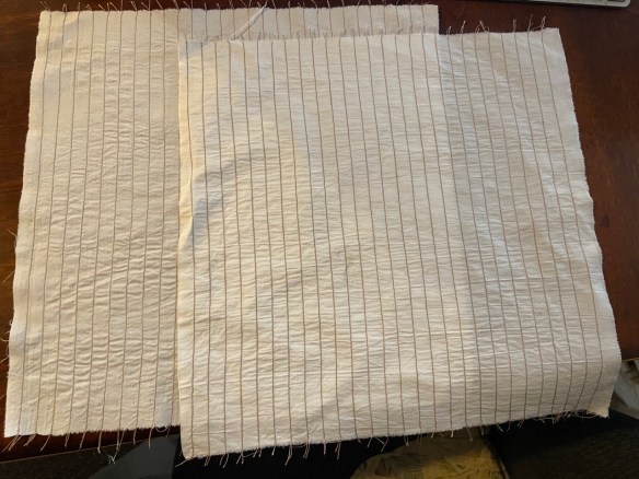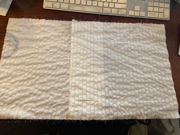 So, I went back and repeated the whole process AGAIN. I don’t think the effort was wasted, as it gave me more sewing practice, and I’m pretty pleased with most of the final stitching. Some lines are still off, but since I need to cut panels that are 6 strips wide, and I have two full pieces of sewn cloth, I can afford to weed out the occasional wandering stitching.