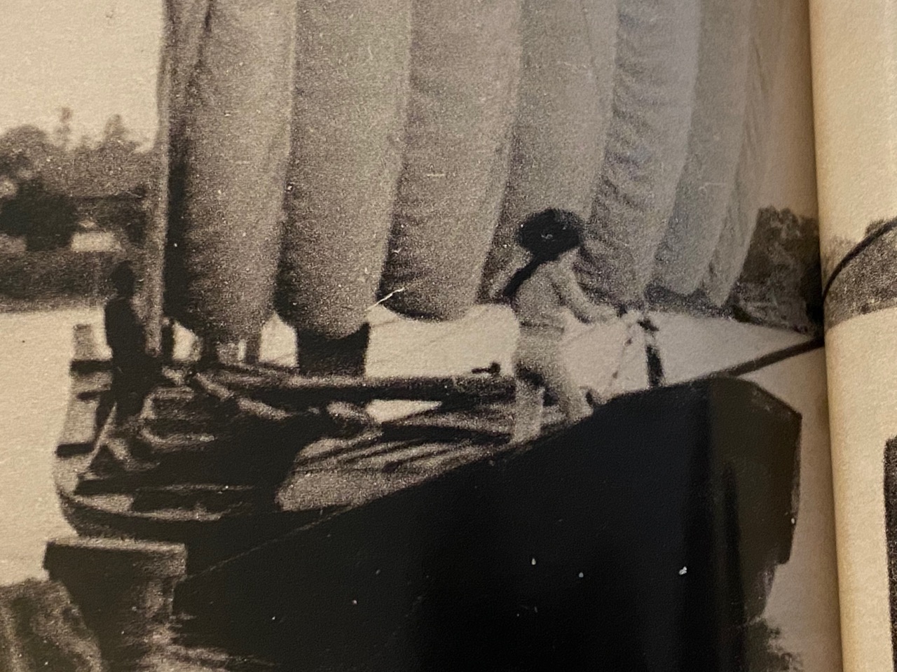 But, getting back to the Kitamaebune, it looks like what is going to look best, at least for my abilities, is to go back to the idea of sewing to simulate the outlines of the separate strips of cloth. I’m using a sewing machine for this work, like I did with the first sails I made.