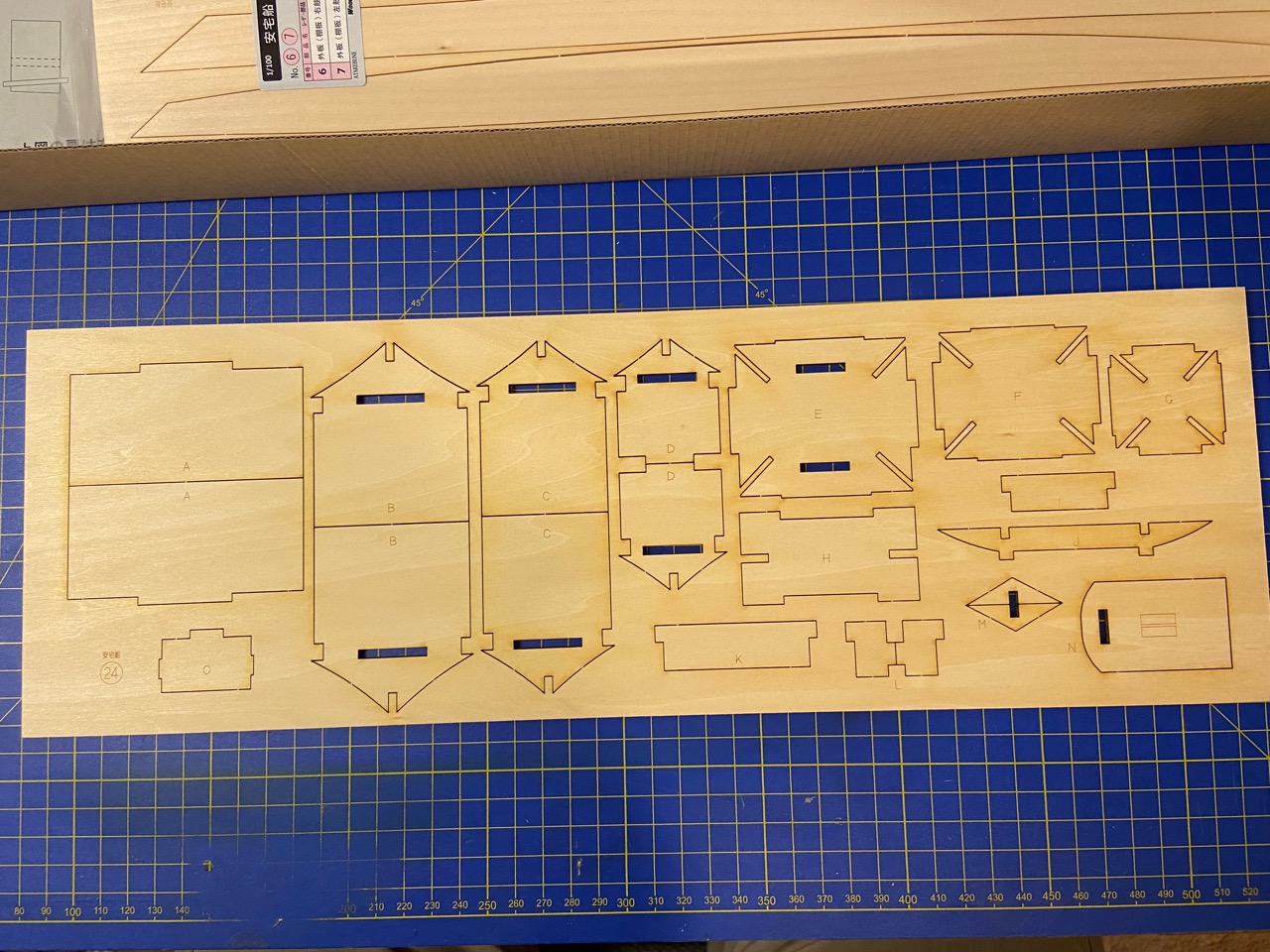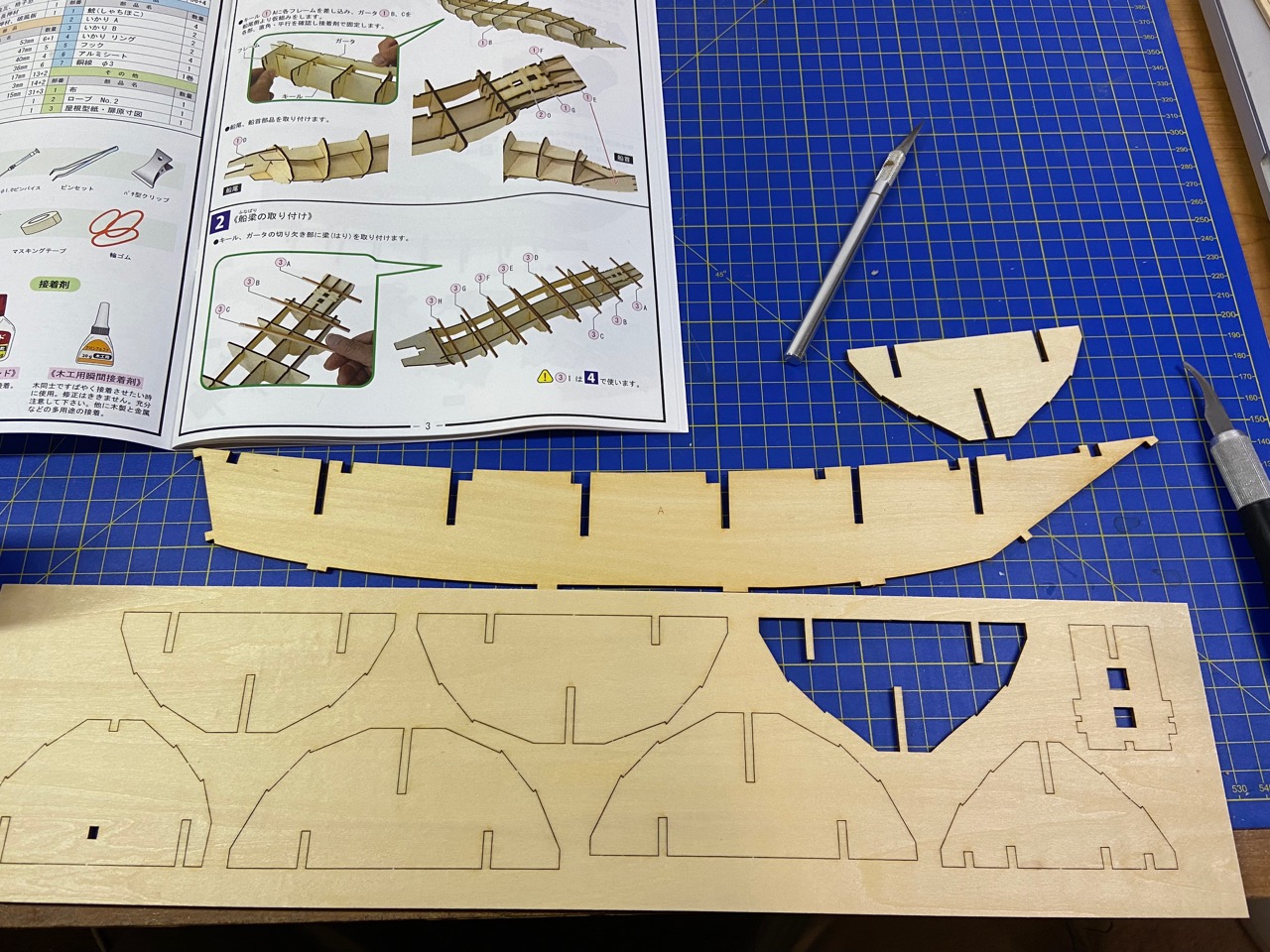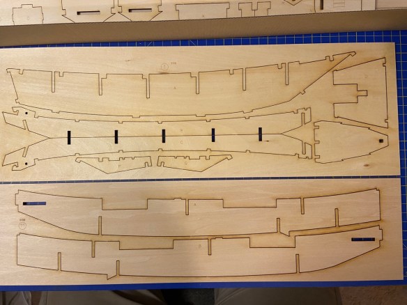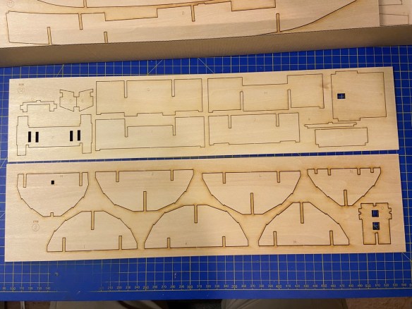 Below, you can see the first parts I’ve cut out for the hull skeleton. But, at this stage, I’m just test fitting. Next time, I’ll have some parts glued up.