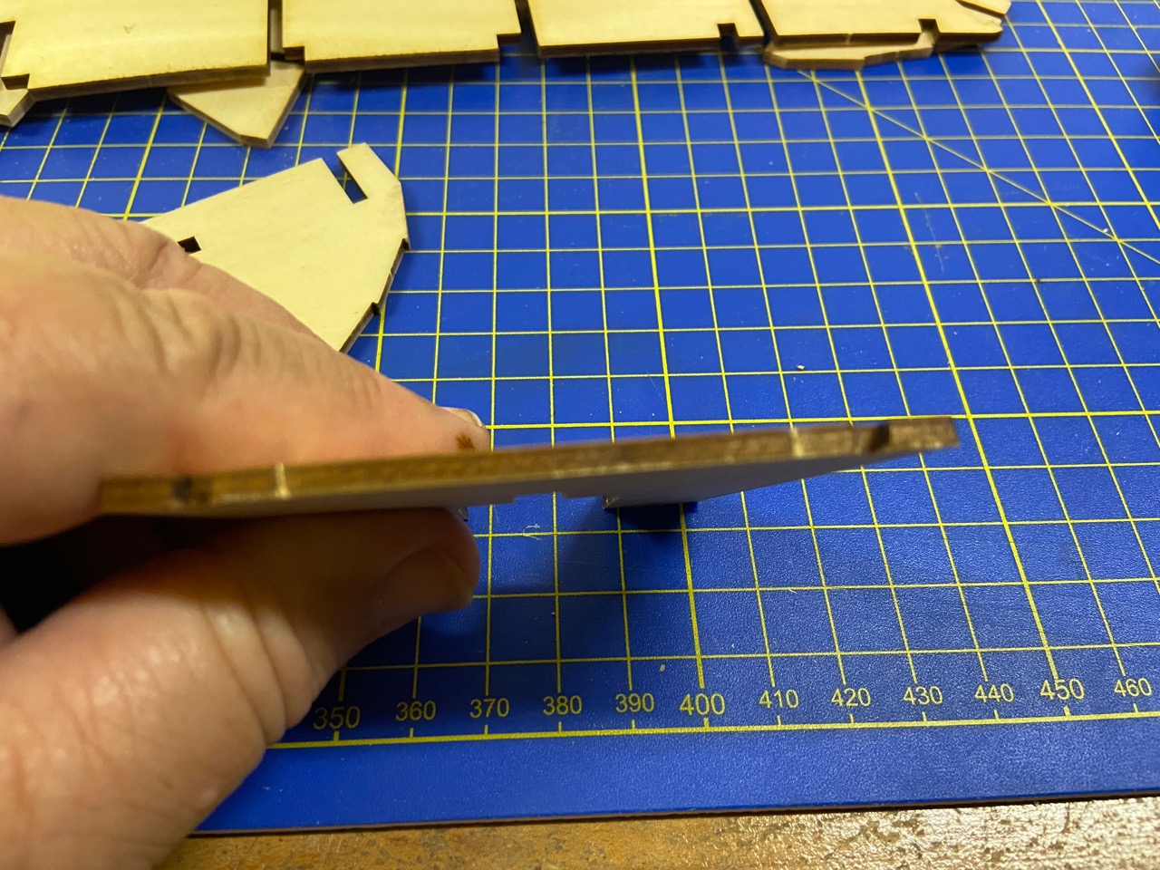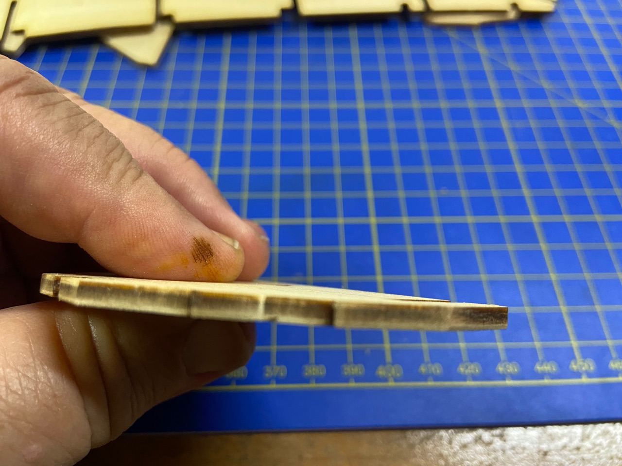 With laser cut parts, you always end up with char on the edges. As ship modelers, we’ve trained ourselves that char must be removed to make for better glue joints. But, with laser-cut kits, you have to be very careful about this, as the kits are engineered to fit together as designed. It’s a good idea to file off some of the char, but you don’t want to remove much wood, as that will change the way parts will fit.