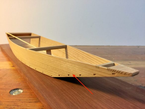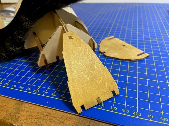 Since I’m dying the wood, these tabs shouldn’t be as noticeable as on a kit built straight from the box. Still, I’ve considered solutions, and one is to thickness sand the bow and transom pieces down by 1mm, then use 1mm sheet wood to cover them. The covering wood will have no holes in it, so no tabs will be visible. In order that everything still fits together, I will have to file the tabs down by 1mm.