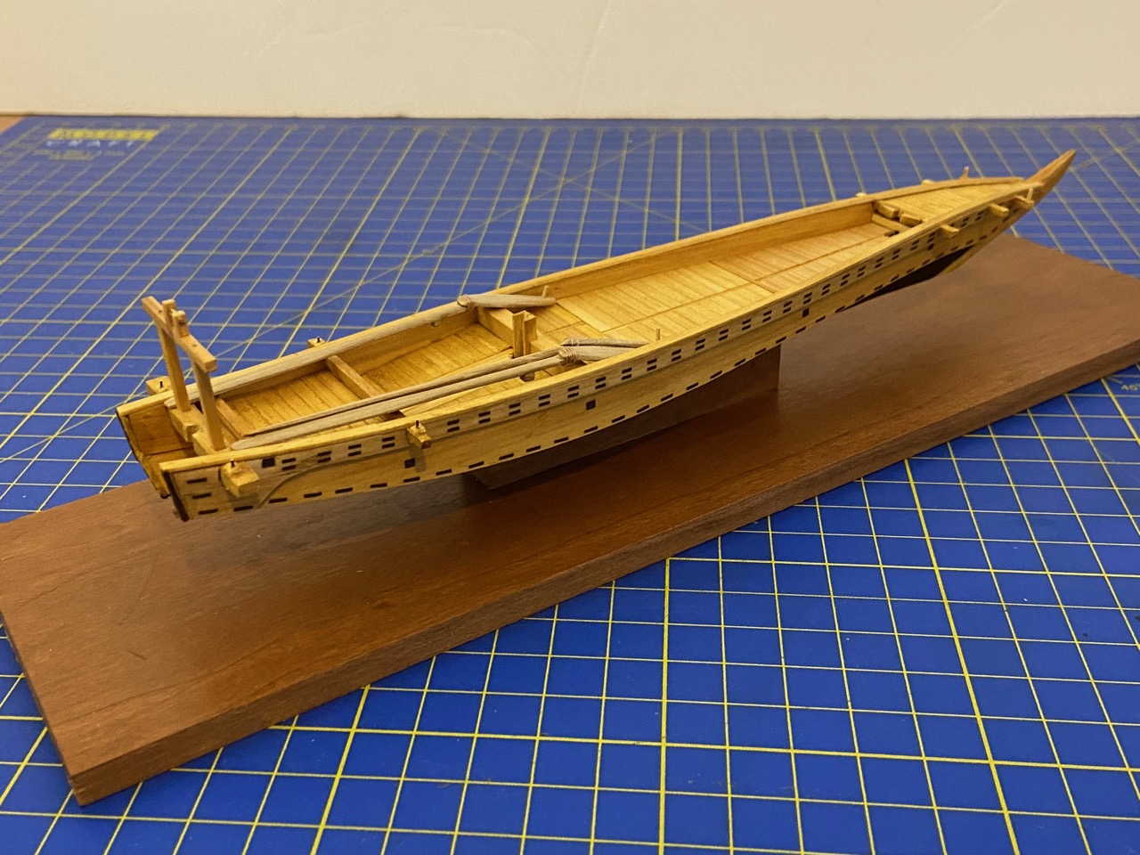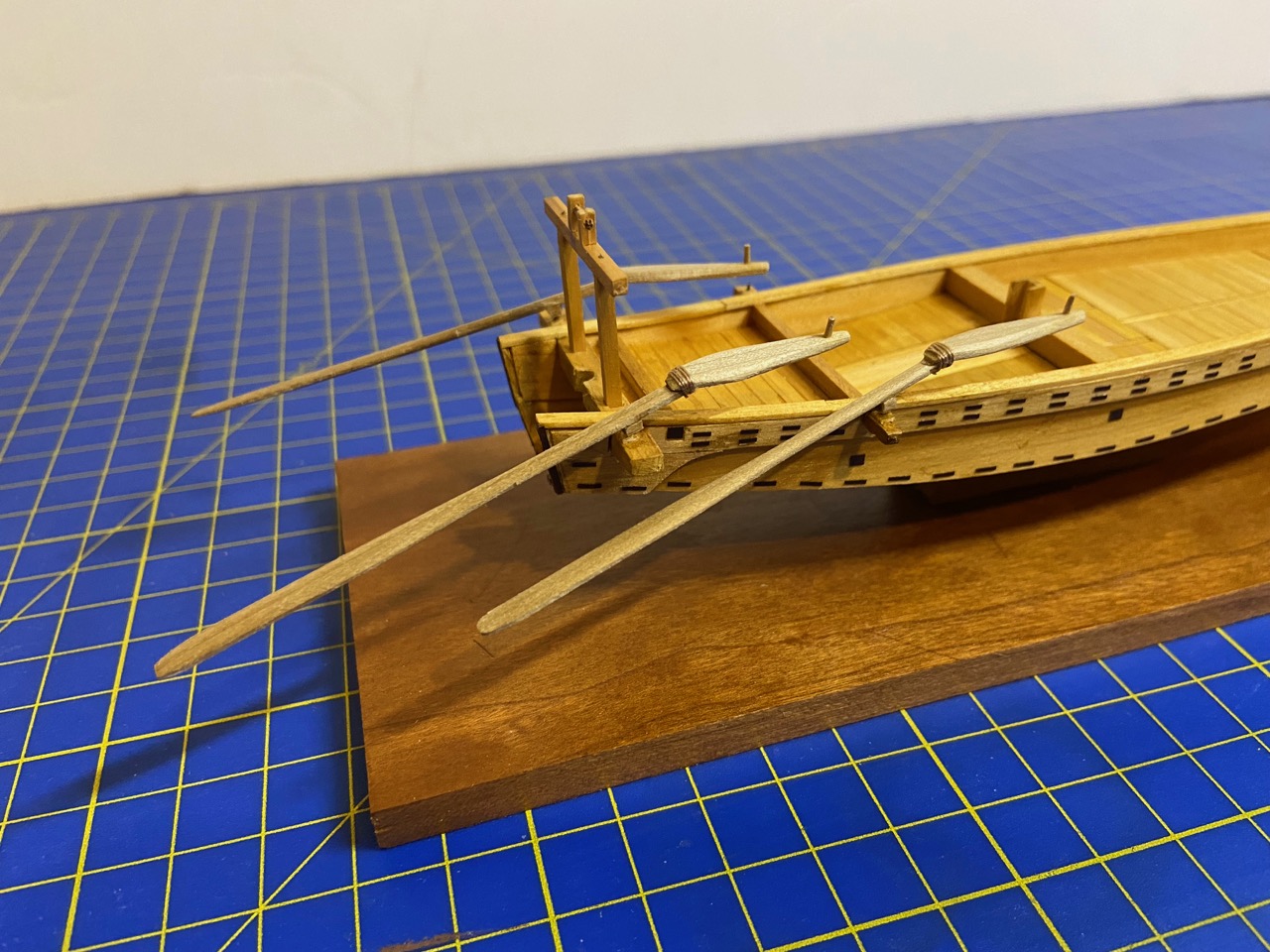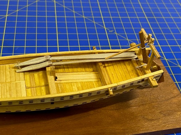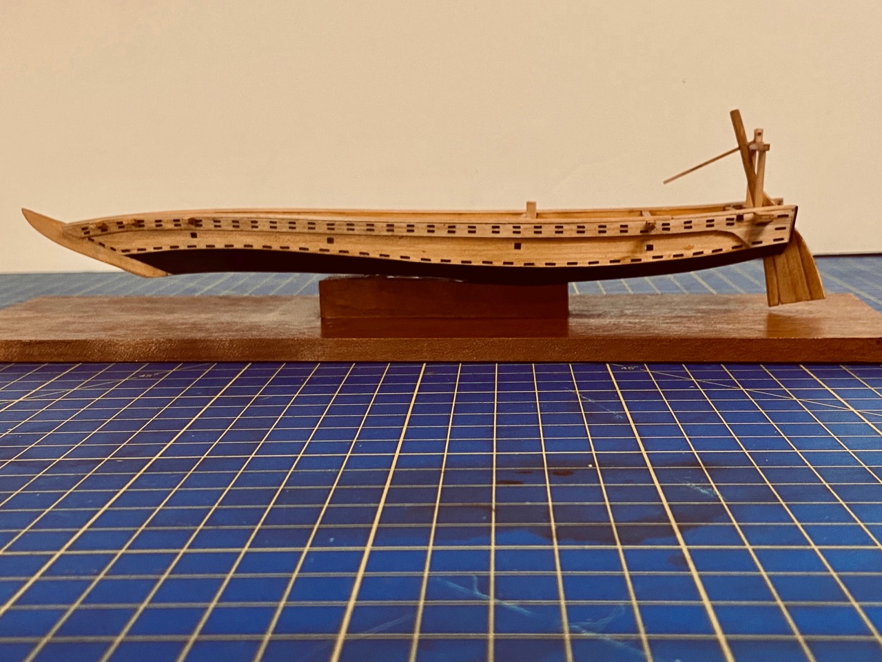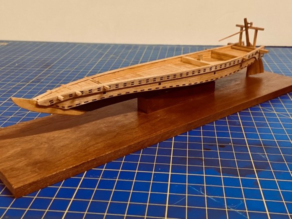 In the meantime, this boat is essentially complete. I’ll make at least one more final post when I get the sails done and make a final call on the wave boards. Anyway, even if wave boards were possibly used, they were removable, and a model like this could easily be displayed without them.