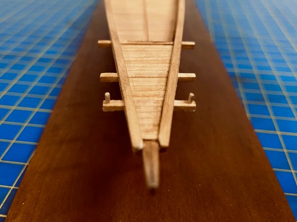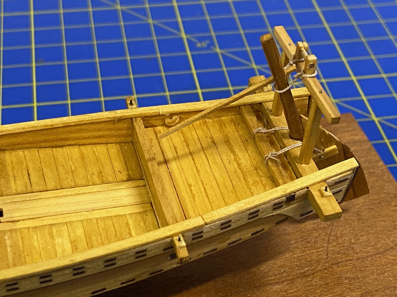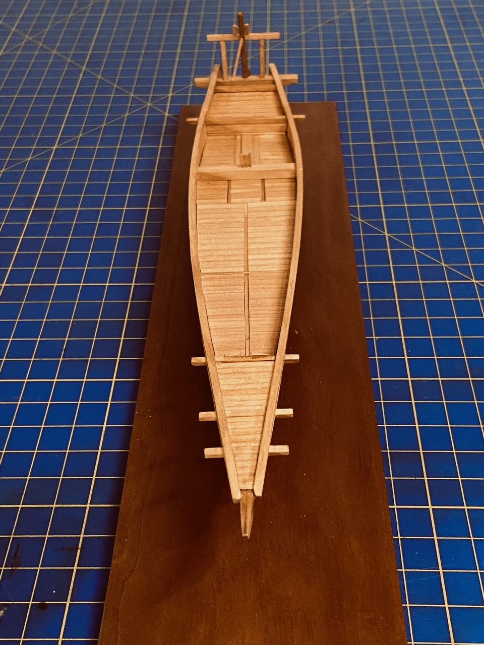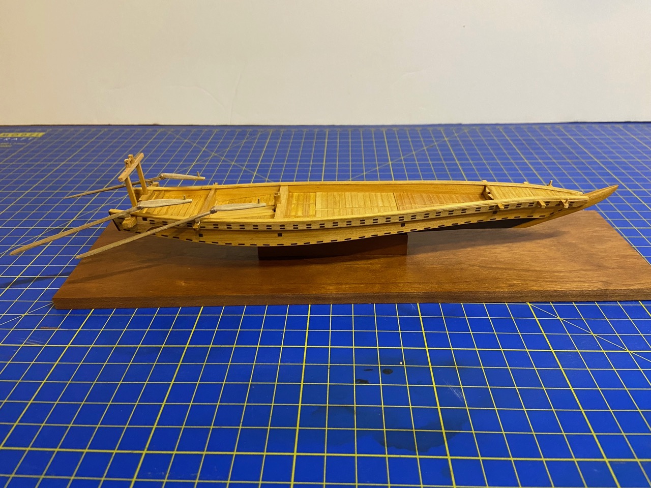 In the meantime, this boat is essentially complete. I’ll make at least one more final post when I get the sails done and make a final call on the wave boards. Anyway, even if wave boards were possibly used, they were removable, and a model like this could easily be displayed without them.