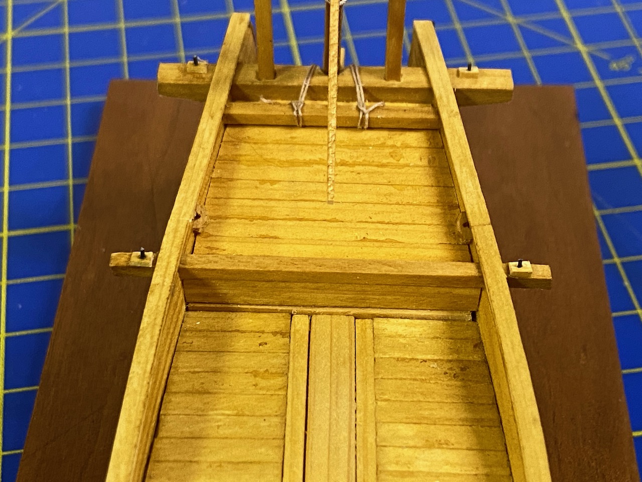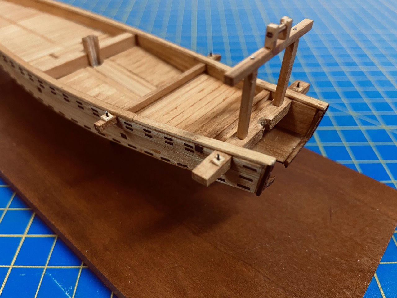 And, while these aren’t shown on the drawings, I added pins to the fore most beam that aids in the tying off of mooring and other lines. These are often tapered with a kind of facetted ball at the tip. Again, I don’t recall the term for these.