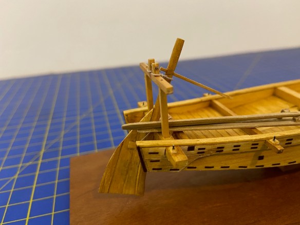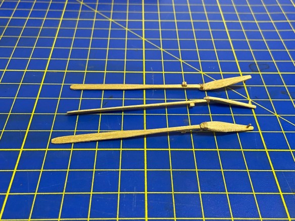 Now, I’m not planning to actually mount the sculling oars on the model, but if I did, they would look like you see in the photos below. As I mentioned above, these fishing boats are described as being operated by two or three fishermen. It made the most sense to include three oars, though if there were only two fishermen, they might leave any extra oars or equipment on shore to reduce the deck clutter. Of course, given that the deck boards are removable, they might have simply stored the oars below. But, I’m guessing they might reserve that space for fishing nets and floats, etc.