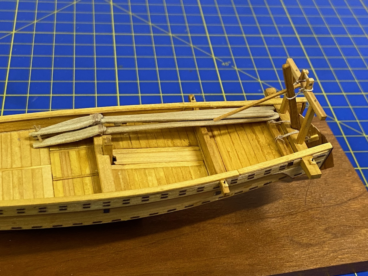 Most likely, I’ll simply stow the oars on deck, as much out of the way as I can. The only problem is that I have no information on how the fishermen operated, where on the deck they mostly worked, where the sail lines tied off, or where they dump their catch. So, I’m not really sure where exactly “out of the way” is, and I’ll just have to make my best guess.