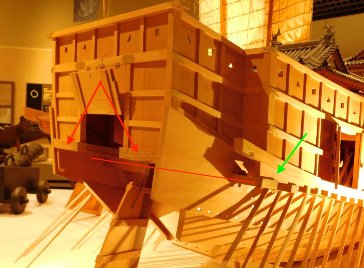 What’s really more important to me is that there is a beam at the stern of the ship that’s usually called the ōtoko, or great beam. This is notched at the back, and provides stability and a point of leverage for the large rudder. The kit actually places the rudder in front of the beam instead, which would prevent the rudder from being raised up, the way all Japanese rudders are designed to do. Again, you can’t see this from normal viewing, but I wanted to make a bit of a correction.