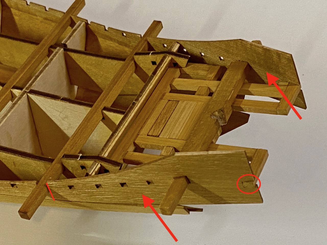 Now, one major benefit of doing this is that I could then make the model really look more like the museum model, as the box structure doesn’t ride directly on these aft-most beams. There is a curved filler piece in between, as you can see marked by the green arrow in the photo below.