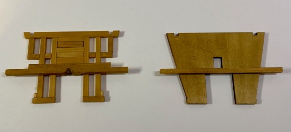 Meanwhile, on the lower hull, as you may recall, I wrote about changing the design of that trapezoidal piece at the stern (tomo) of the ship. The kit provides a solid piece, and it would most certainly have been built-up from beams and planked over on the real ship. So, I came up with a structure that mimics what I believe that structure would have been like. So far, it’s without any deck planking.