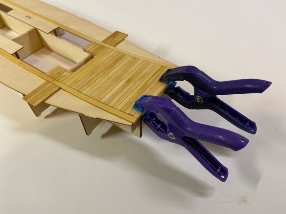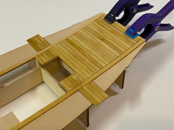 It wasn’t long before I had the bow section done. Note that in order to keep the middle and outer planks aligned, the instructions show to start the planking from the edge of deck opening, working outward from there. Later, those plank ends that are sticking out over the edge of the deck will need to be trimmed.
