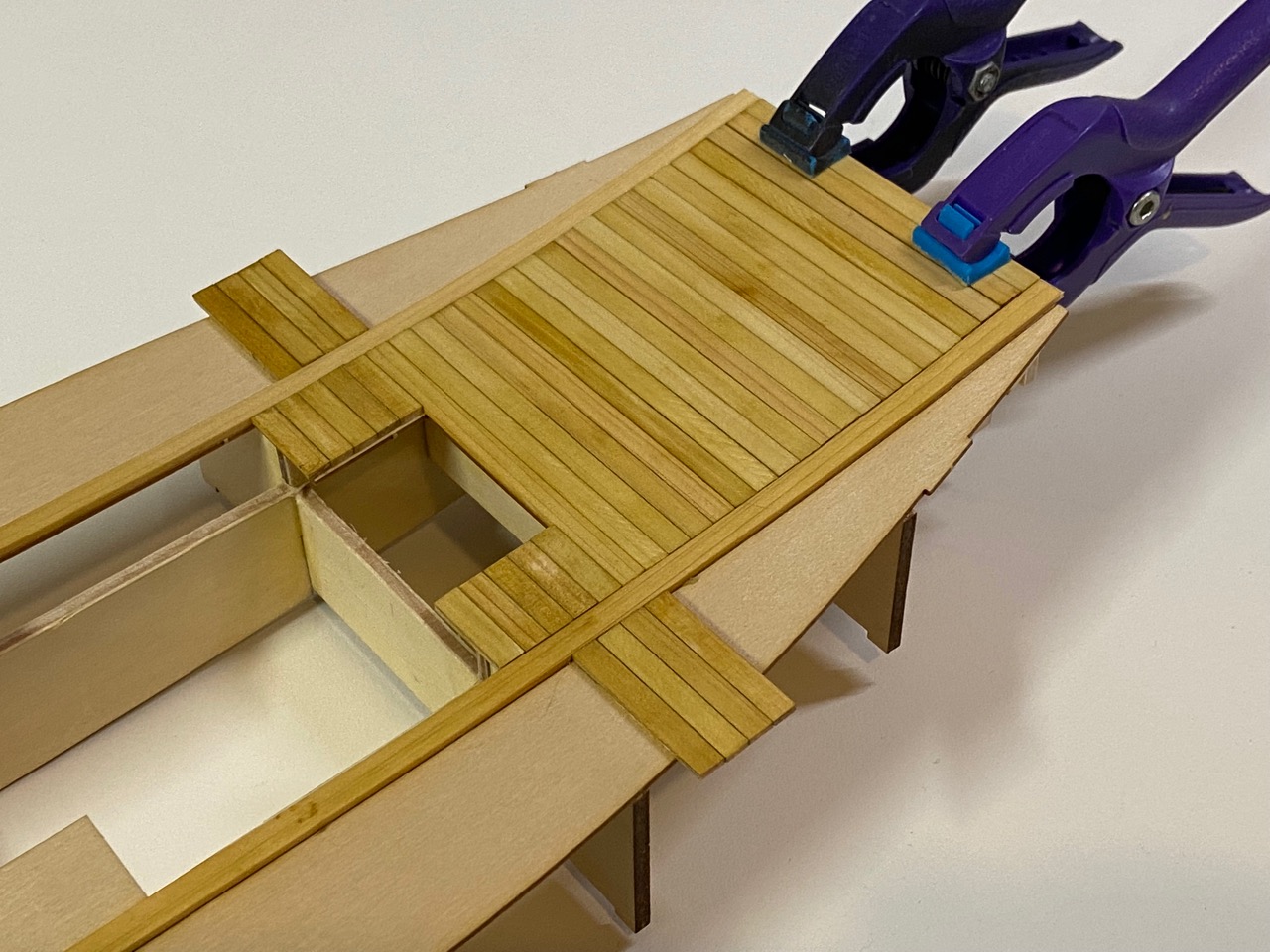 After that, it was a rather quick matter to lay down the long fore-and-aft planks, and then the rest of the planking pieces.