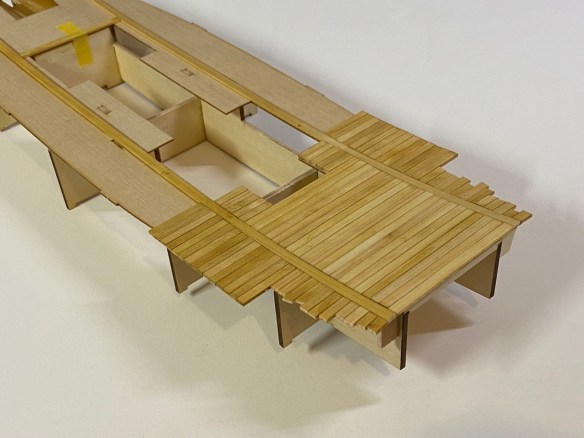Today’s is a brief update. I’ve started adding the plank onto the main deck. For this kit, Woody Joe has opted to provide 2mm thick planks for the deck. I suppose they are so thick, because the sub-deck they are glued to is pretty thin.