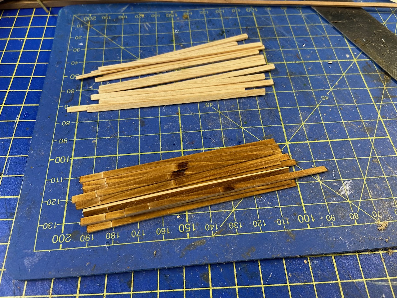 Next, I’ll need to get back to finishing the lower hull modifications. But, before I get to that, I thought I’d start taking care of the many sculling oars I’ll need. These are partial oars, so I don’t have to make the whole oar, just the lower part that sticks out of the ship. This ship is represented as having 36 pairs of oars.