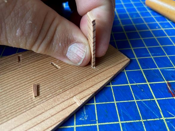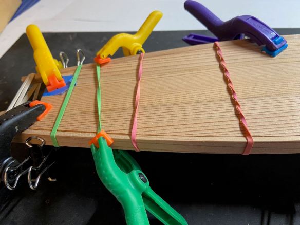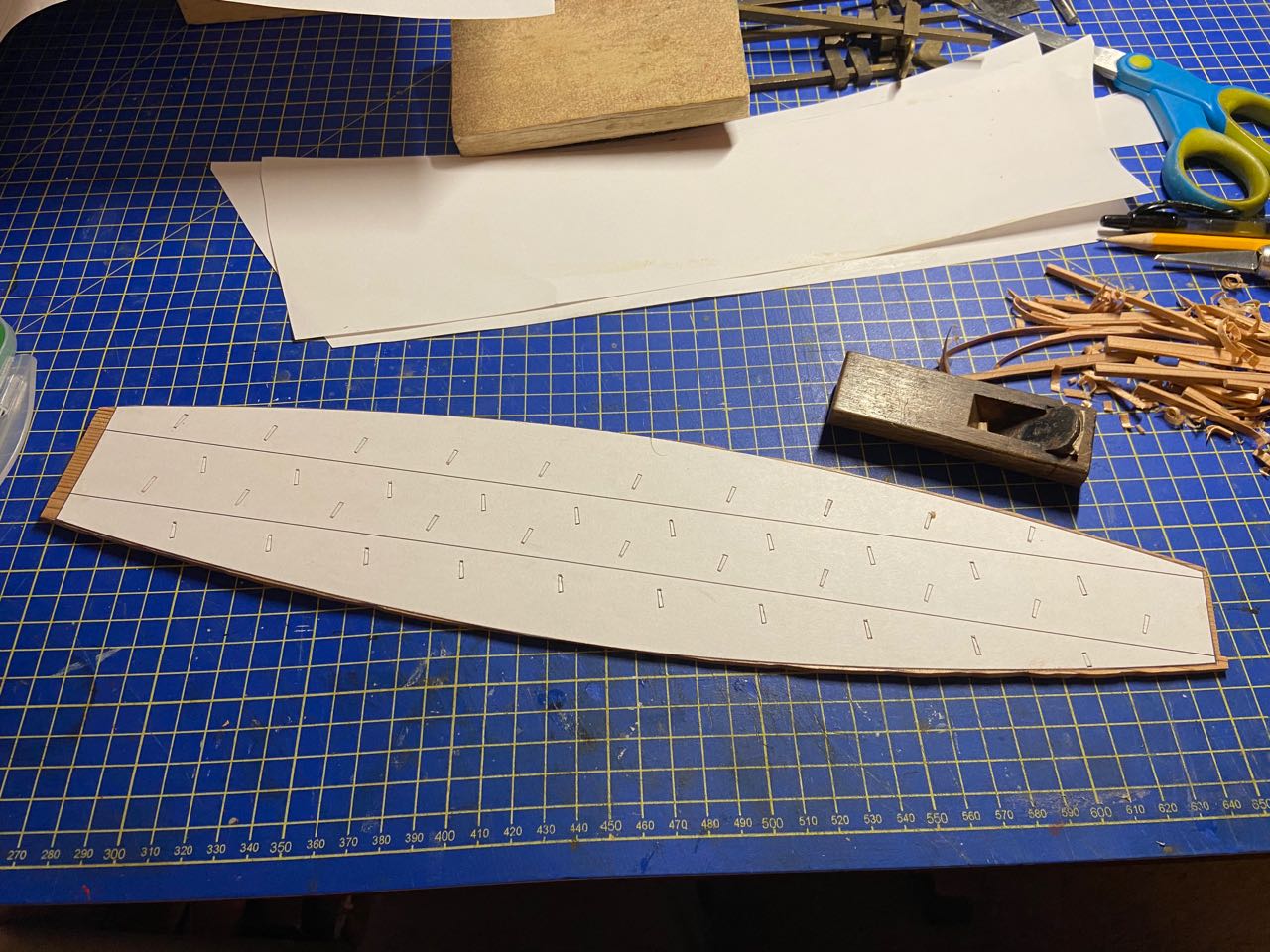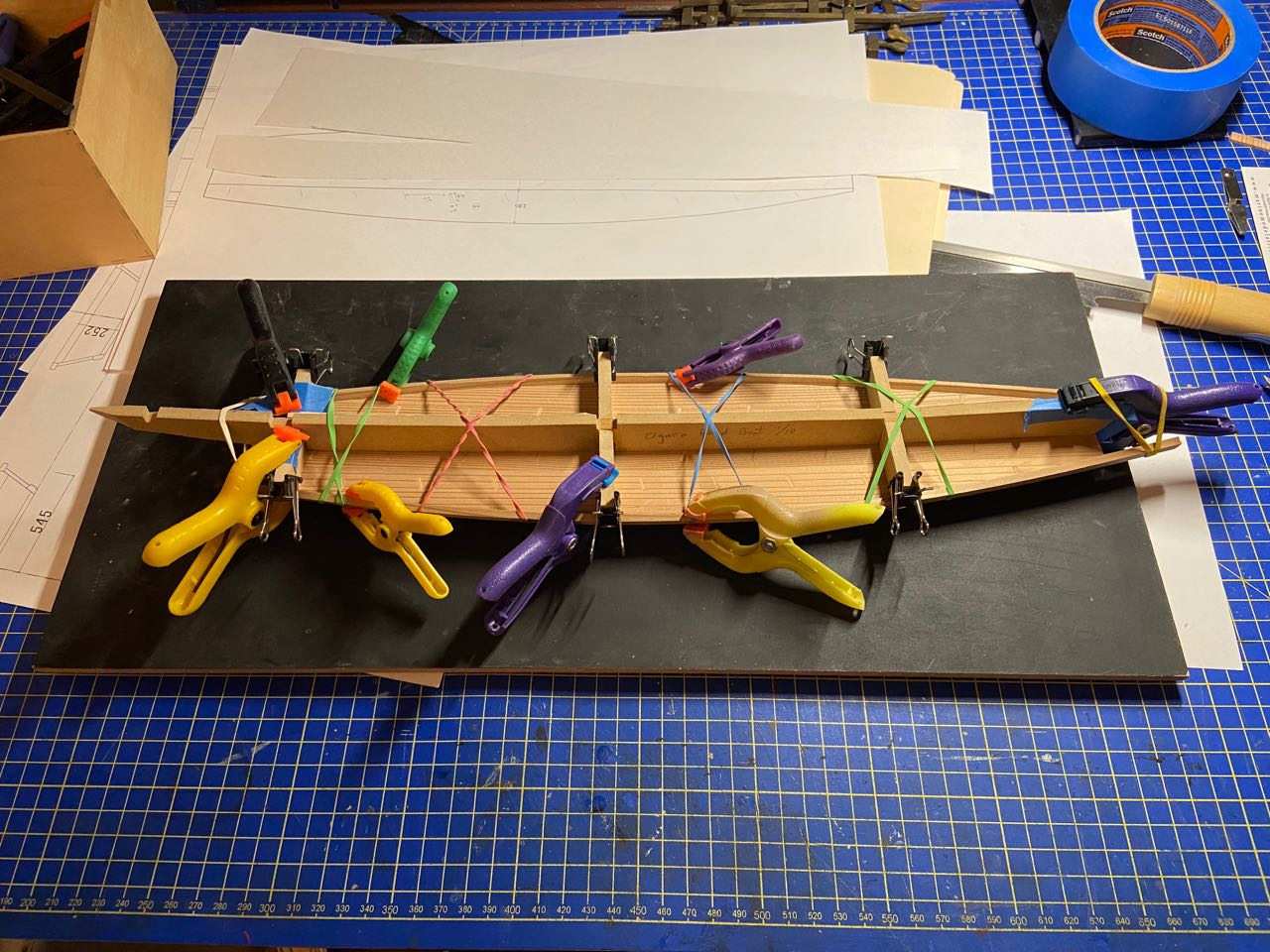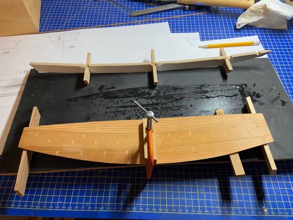 It wasn’t clear to me at the time of building whether this lower plank should be simply attached to the main hull plank and then the whole thing fitted to the bottom board, or if it’s better to just attach the lower plank to the bottom board, and deal with the main hull plank later. On the real boat, it would have made sense that this lower plank was attached to the main hull plank first, for reasons that may be more obvious later. However, I opted to add the lower plank to the bottom board first.