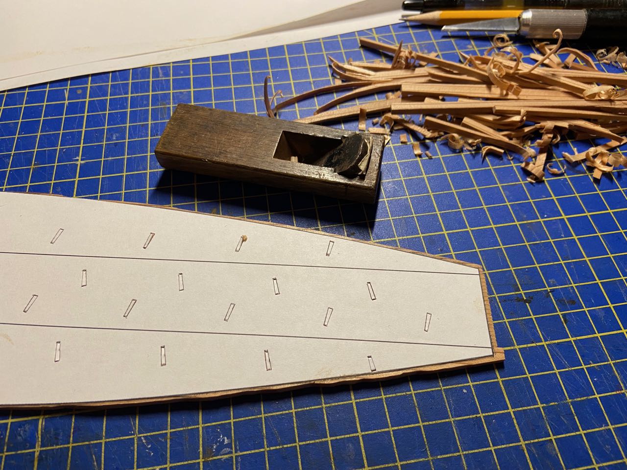 Next time, I’ll show the mortises cut into the lower plank, and will be adding the main hull planks.