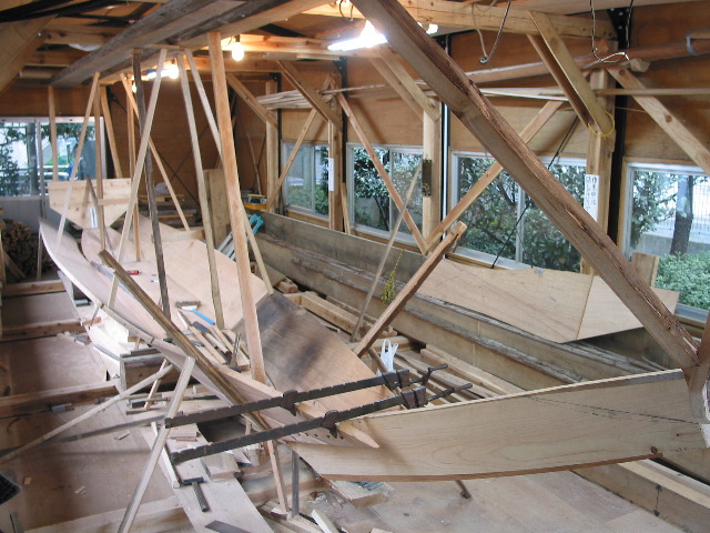 The next step is fairly simple for this model, and it’s to impart a slight curvature of the shiki. What I do basically mimics the way that the boats are actually built. An actual wasen boatbuilder, called a funadaiku (船大工), would prop up the ends of the shiki using blocks, and apply opposite pressure at the center, either using heavy stones, or by using posts and wedges propped against the ceiling beams of the boat shop.