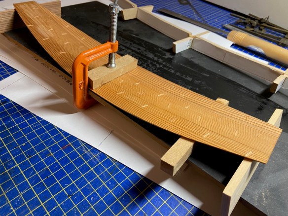 In the case of the model, this can be accomplished using props and clamps. I prepped a building board made of medium density fiberboard (MDF), which sits on runners gllued underneath that are tall enough that I can easily fit a c-clamp, which is what I’m using here to push down on the middle of the board.