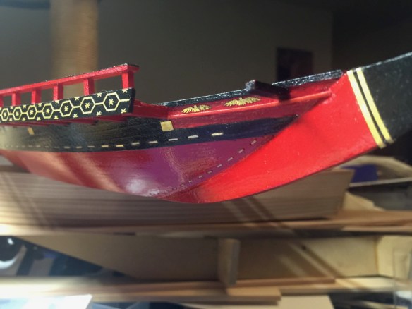 You might notice in my photos above that I added a strip of molding at the bow, just under the phoenix, to match the drawings. Also, there is still a matter of a small decoration between that forward beam and the stem. In the drawing, it’s very hard to decipher. It kind of looks like a cursive letter P. Clearly, there’s no reason the Japanese would put the non-Japanese letter P on the boat. On the French museum model, the builder put what looks like a sideways letter S, though I’m sure it was just meant to be some squiggly decoration.
