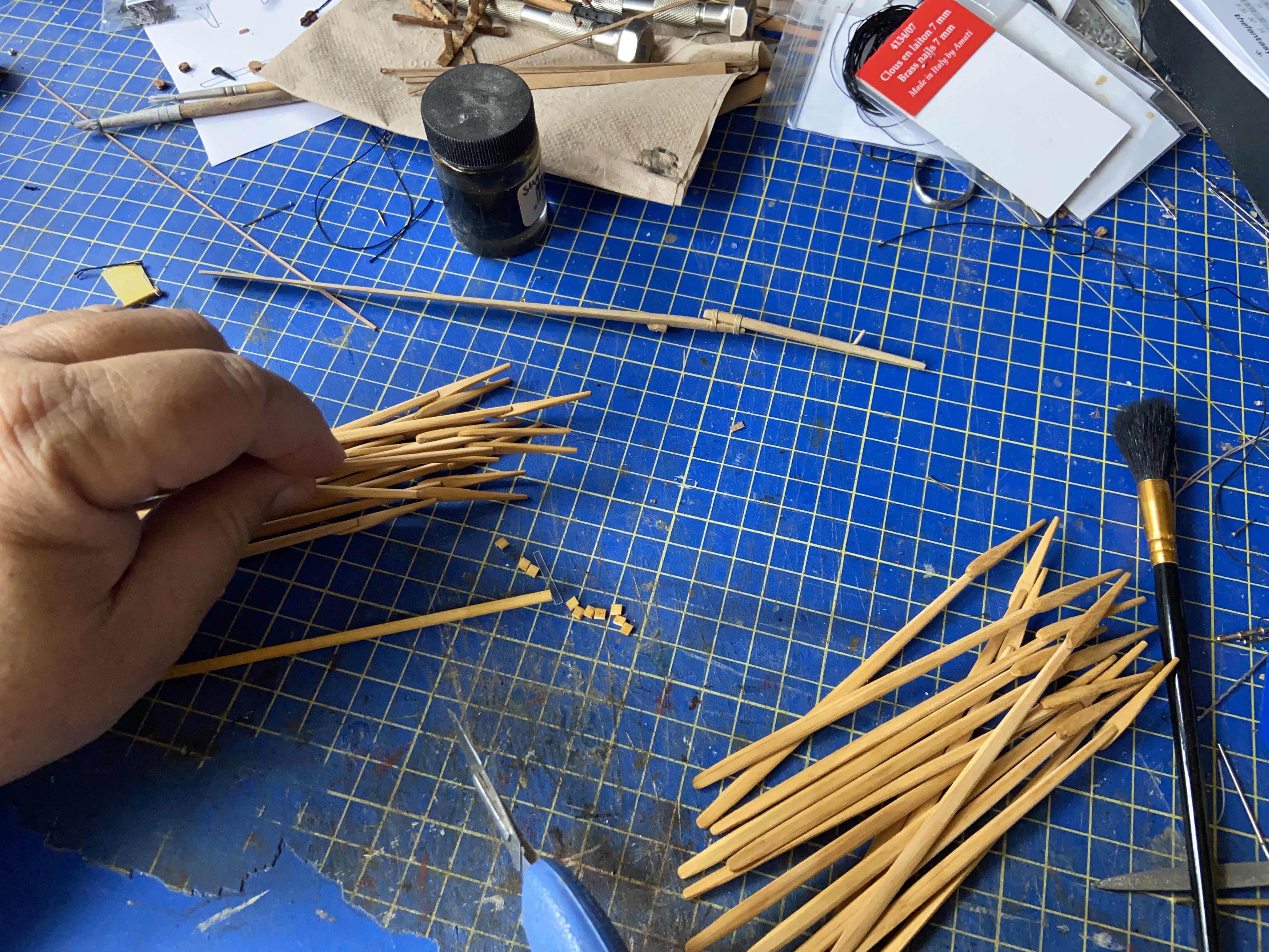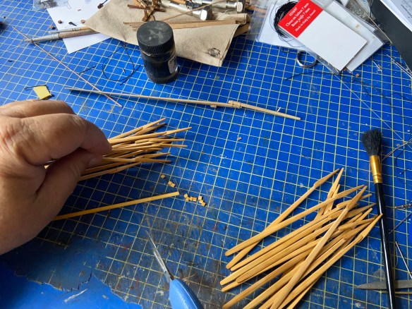 Japanese sculling oars are more complicated in shape than most western-style oars, so I’ve had my work cut-out for me, especially given the need for 28 of them. I’m sure any builder of a row galley model can relate.