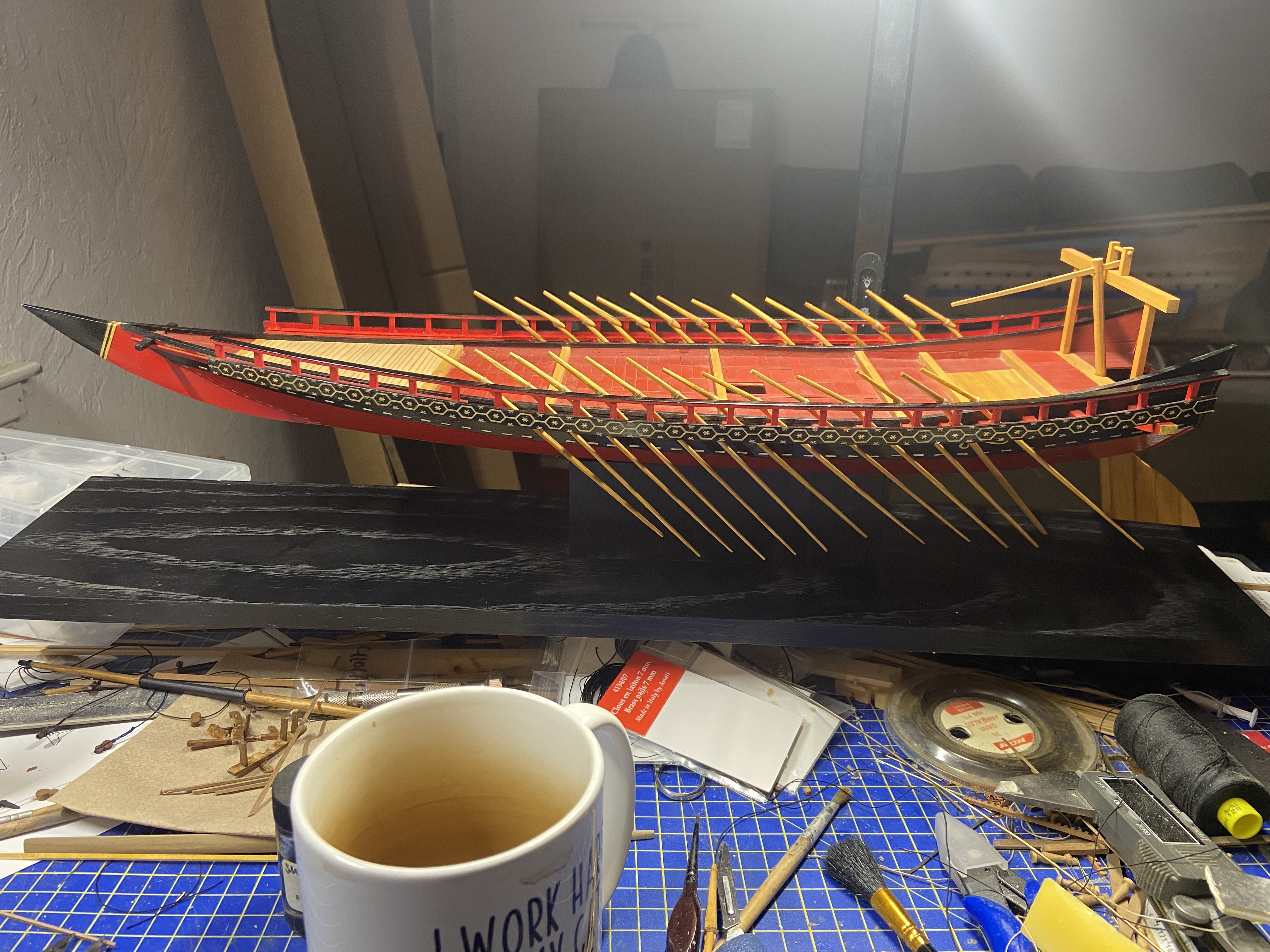 Coming up, I will need to finish the oars, but I also need to make some decisions on the rigging and final mounting of the rudder, adding back a mast step, and creating the yakata, the structure near the bow. I will leave these for the next post.