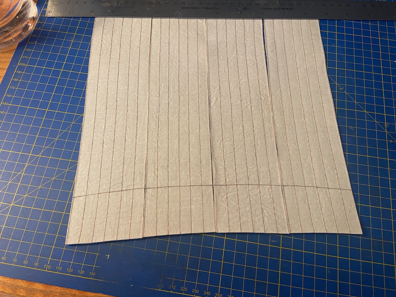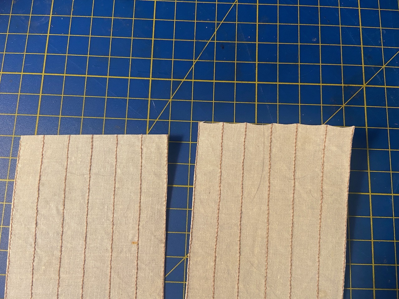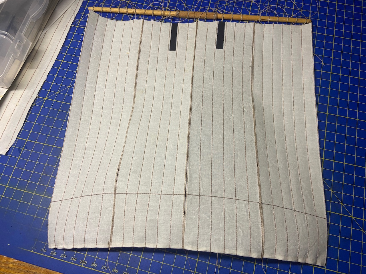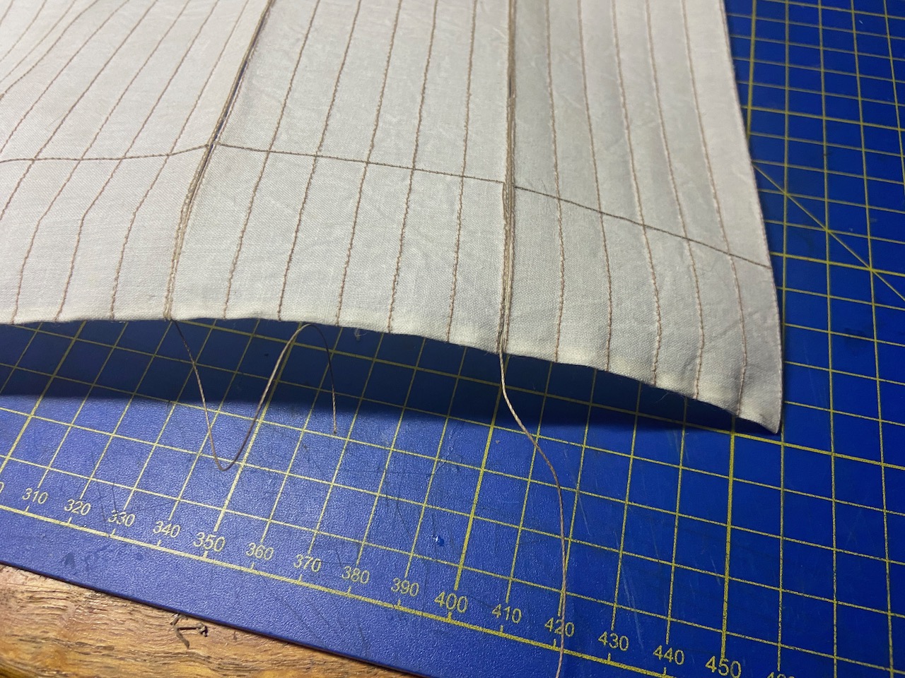 The top edge, I then cut in such a way that it appears scalloped, with the peaks being at each of the stitching lines. On the real sails, the stitching is actually a piece of rope as long as the height of the sail, and tied to the yard. The sail panels on either side of the rope are laced to the rope. So, when the sail is hanging up, it’s held up by these ropes, and the sail cloth in between these ropes hangs a little slack.