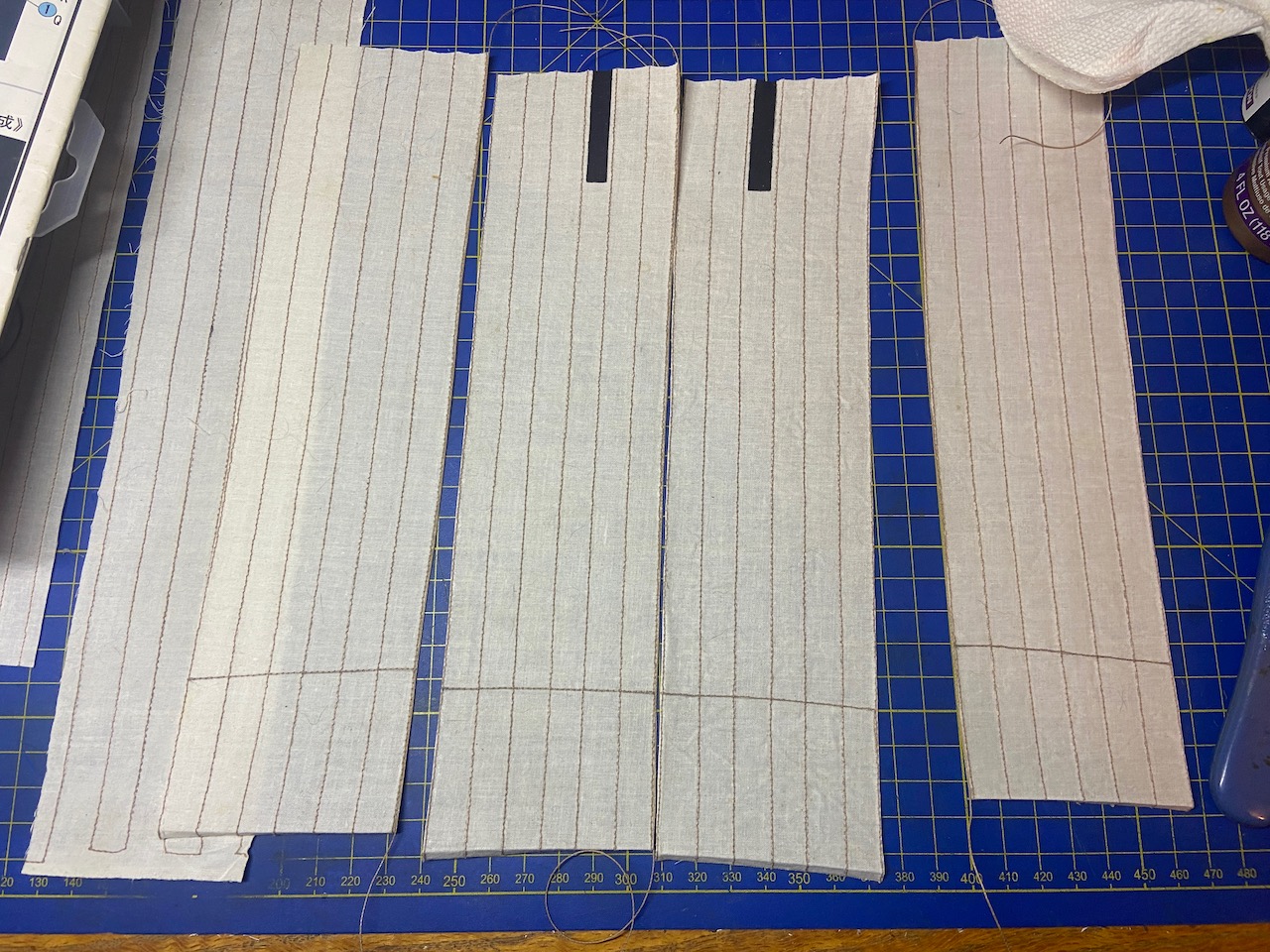 So, as I mentioned last time, I had sewn some new sails and I’ve added some details to it. From my work on the sail of my Tonegawa Takasebune model, I’d learned a few things that should help make these sails look more realistic. After all the sewing was done, I treat the cloth with Terial Magic, which is a fabric stiffener that makes the cloth like paper, but can be washed out, if desired. The sewing itself was treated with Aleene’s Tacky Glue to stiffen up the stitches, and to allow me to cut the whole thing apart into four large panels.