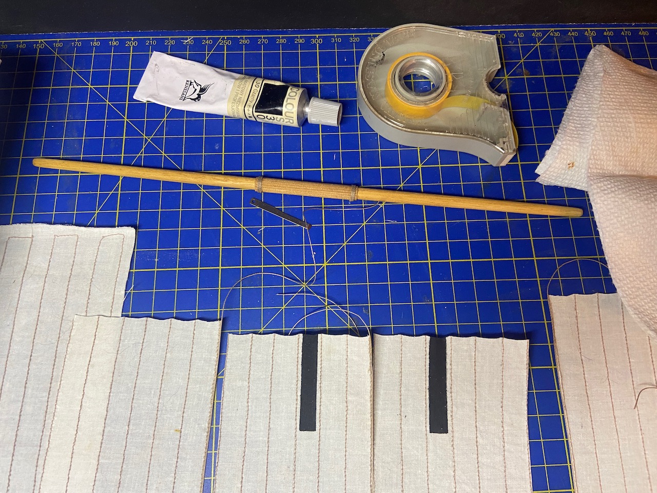 I ran glued a piece of rigging line to one edge of the large panels, so that one piece of line would pass between each adjacent pair of sail panels. Again, I used Aleene’s Tacky Glue. I also created a fold in the bottom edge of the sail, which will be use to conceal a lenth of coated wire. The wire should help me give some shape to the sail.