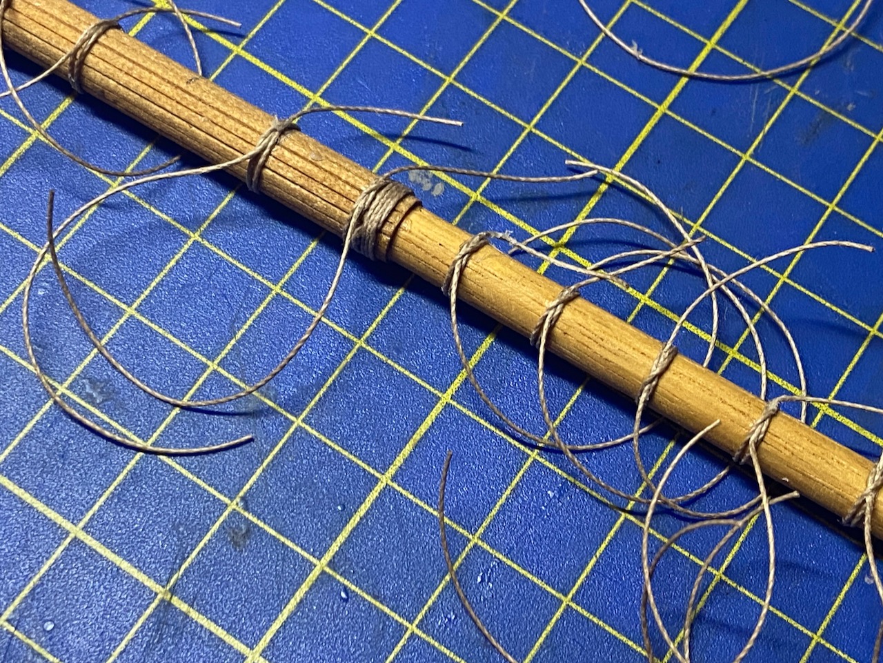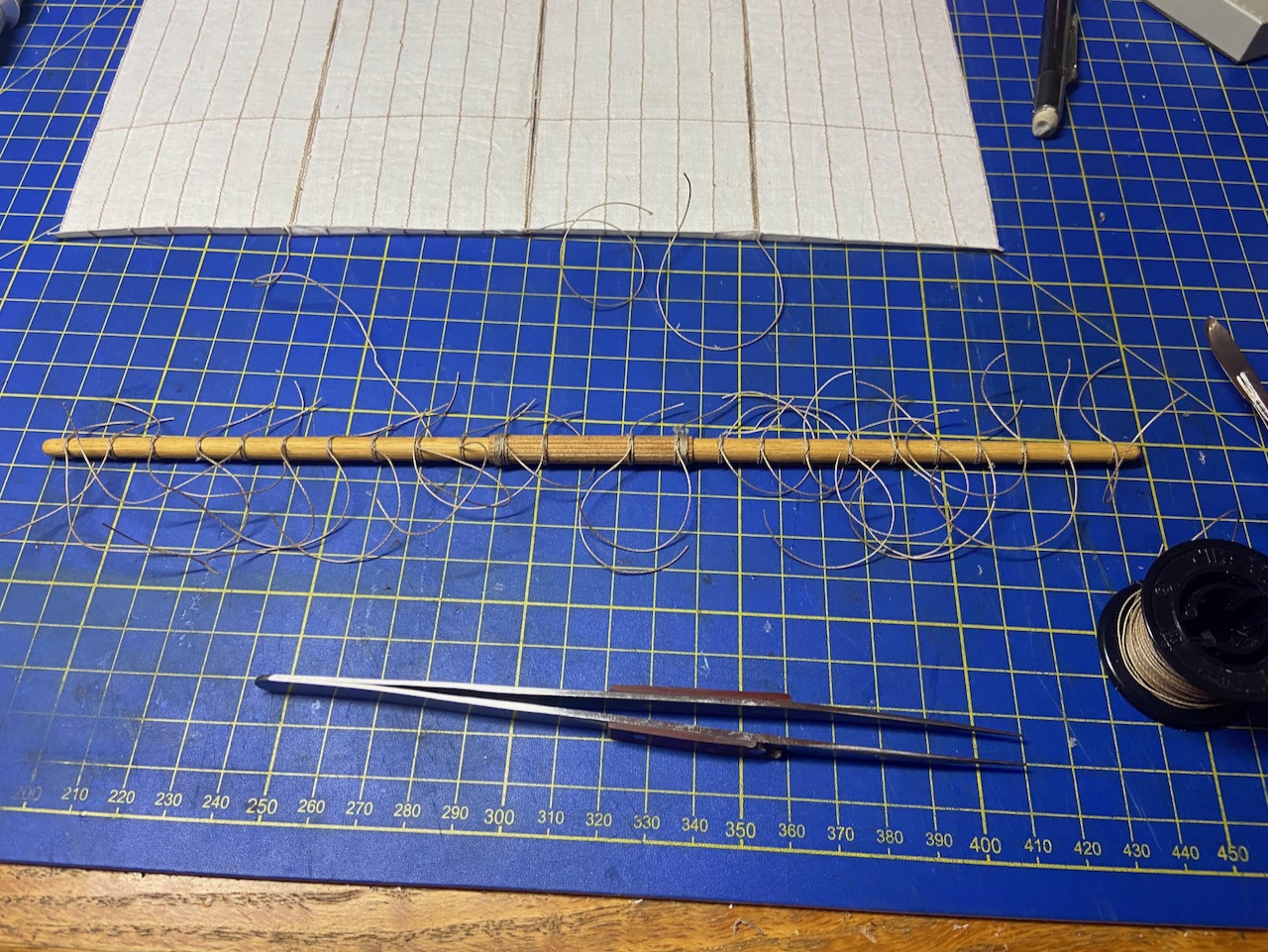 While gluing up and painting the sal was drying, I took the time to add the ropes to the yard according to the kit instructions. These are essentially tied in a clove hitch. This is the same knot used to attach ratlines to shrouds on western ships. However, on this thick yard, tying these was a much different experience. The first 1/4 of the yard took me the longest, trying to tie them using my fingers and not really being able to see the ends of the lines very well. So, I finally got smart and pulled out the headband magnifiers and used a pair of tweezers. The second 1/4 went better, but I needed a break after that.
