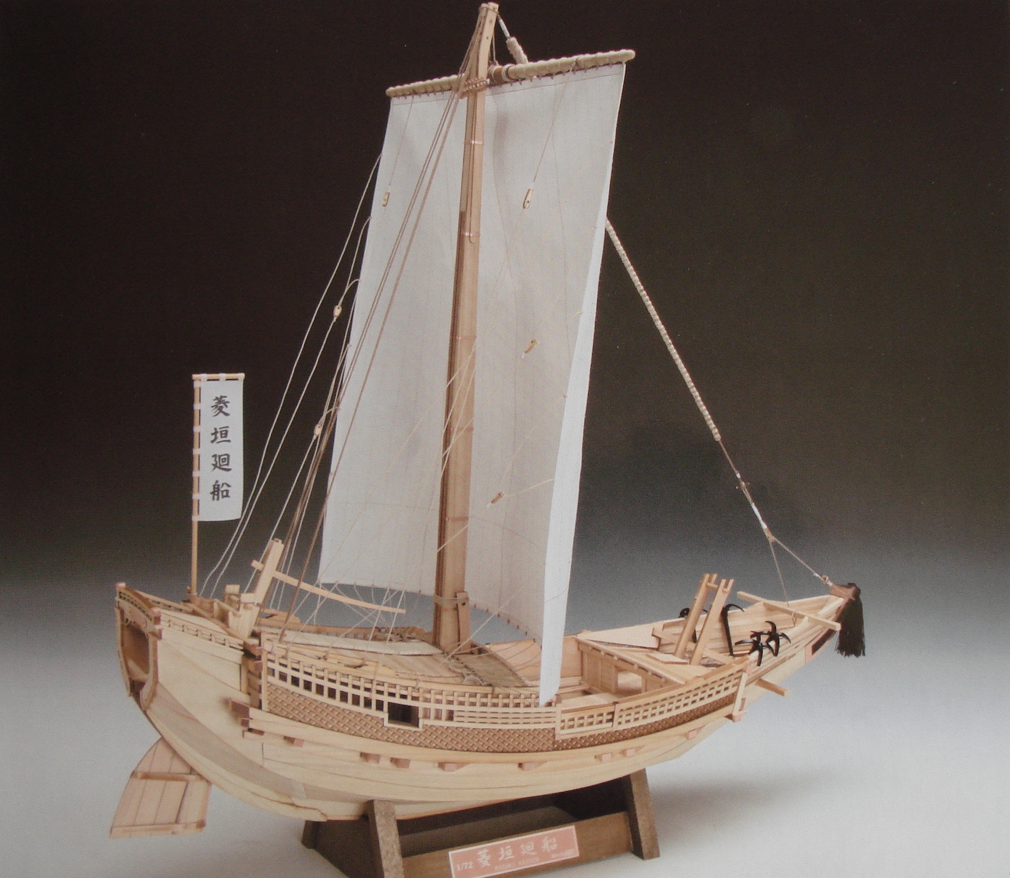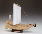 A recently released 1/72-scale laser-cut kit from Woody Joe of an Edo period coastal transport that operated out of the norther ports of Honshu and Hokkaido and the Japan Sea coast. An older kit also made by Woody Joe is now out of production, though might be found through some online dealers. The older kit is less accurately detailed, but is a larger scale, larger model, roughly 1/60 scale. The new kit is at the same scale as the Higaki Kaisen kit. This kit does not have the interior detail as the Higaki Kaisen kit, but construction has been simplified through the use of laser-cut parts. The completed model is about 1-1/2″ longer than the Higaki Kaisen.