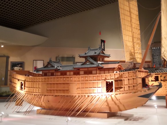 But, the next post, remembering that blogs post newest entries first, described a trip to the Verkehr Museum (verkehn is German for transportation), also in Shizuoka city. This small museum I’ve mentioned in a previous post. It happens to house a number of models of old Japanese ships, including the warships of the Sengoku period.