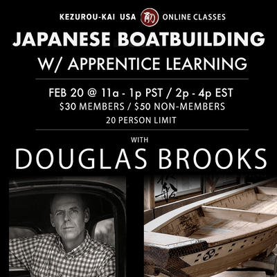 Sorry for the short notice, but there is an online workshop this Saturday, Feruary 20th, from 11am to 1pm PST. That’s 2pm to 4pm Eastern. The Zoom-based workshop is being hosted by Kezurou-Kai USA and there is a fee of $50 for non-members and $30 for members. Douglas will be discussing the building of Japanese boats under the traditional Japanese apprentice learning system.