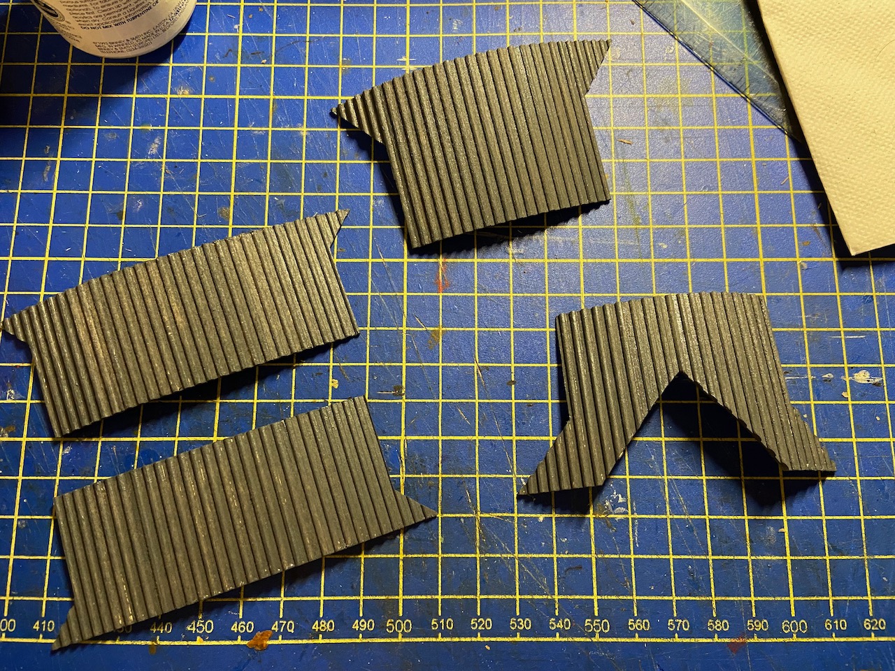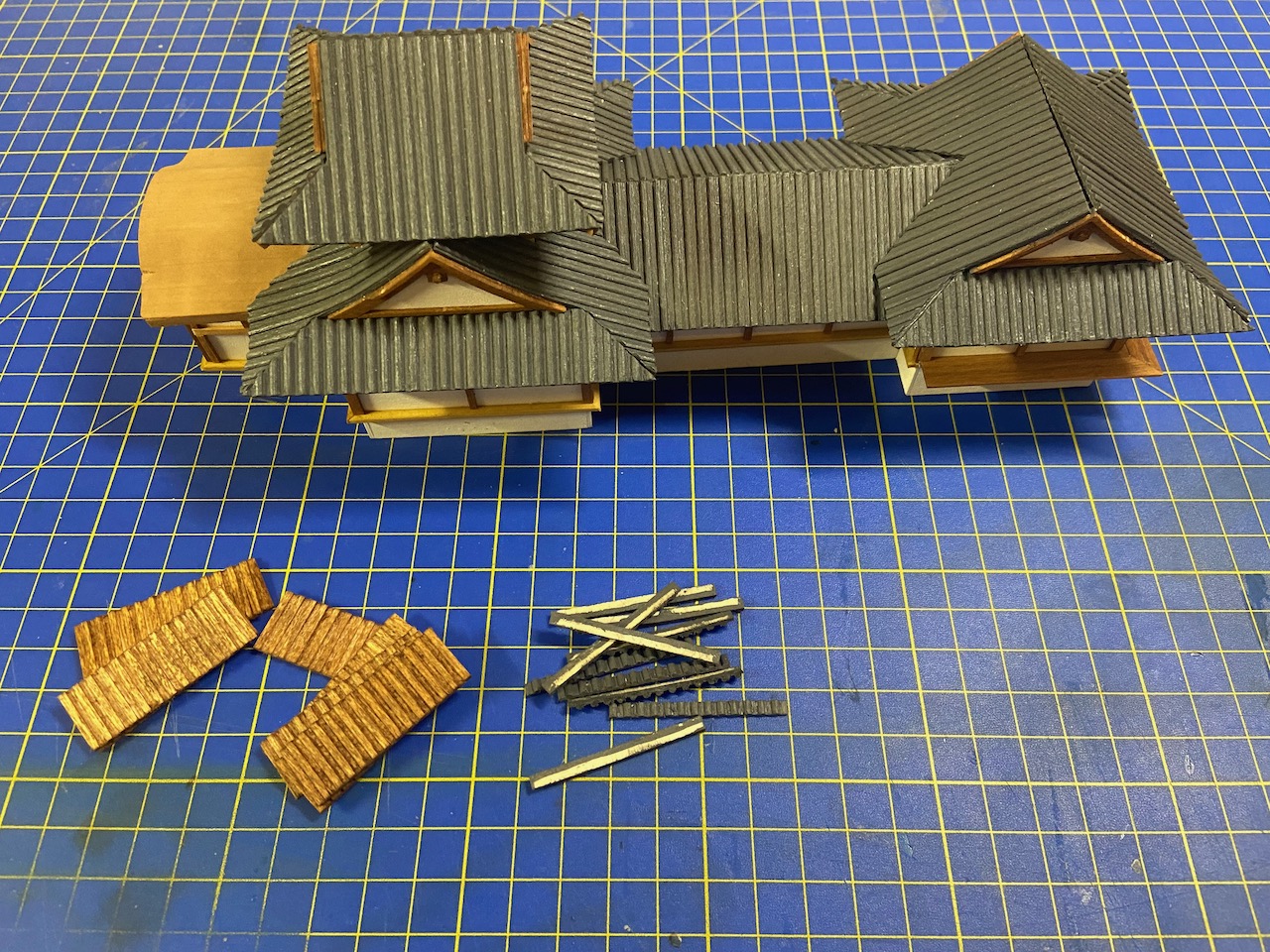Next up was to begin working on the castle structure roof. most of which is made from milled material that resembles a tiled roof. However, the roof of the forward part of the castle structure, specifically the one I extended, was designed to be made up of individual arch-shaped pieces. Since that section has been lengthened, the provided roof pieces would no longer work. What I did then, was to use the provided pieces as beams, and for the roof itself, I cut a piece of thin pear wood veneer.