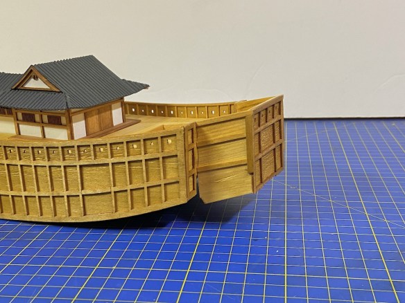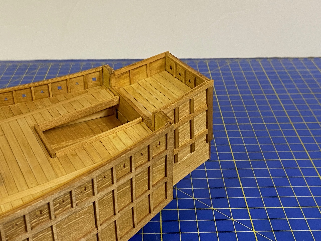 Continuing with the Atakebune’s castle structure, I began looking at the little walkway and decorative railing at the back end of the structure. Considering that I’ve lowered the main deck of the ship, I needed to know how high above the deck this railing would be. So, I assembled the pieces to allow me to test fit the parts in place. While I was at it, I made one small modification here, which was to make the walkway from separate strips of wood, using the kit provided pieces as patterns for the walkways.