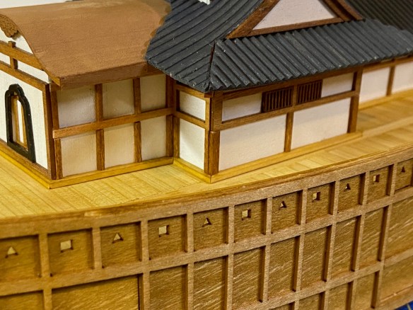 With this particular roof section done, I could complete the rest of the castle structure roofing. This type of construction is quite fun, and it’s very different from any ship modeling work I’ve done before. I’m already familiar with building these castle roofs as I built Woody Joe’s Iwakuni-Jo castle several years ago, one of their smaller castle kits. I won’t go into a lot of detail here and just offer some progress photos.