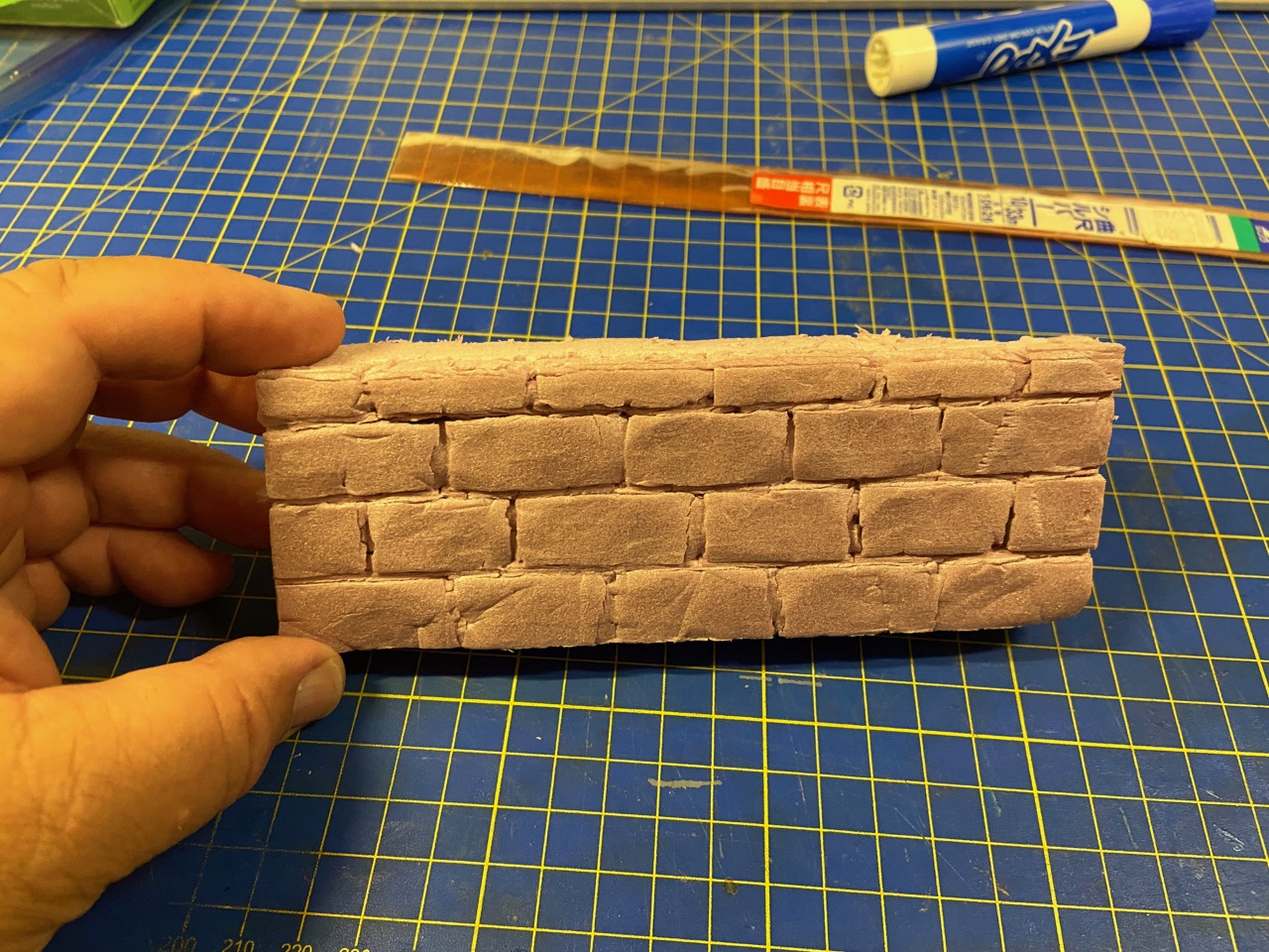 For this, I simply drew a pattern on the face of the foam, and I used the end of a small steel ruler to score the foam, which gave the wider-looking gaps between the stones.