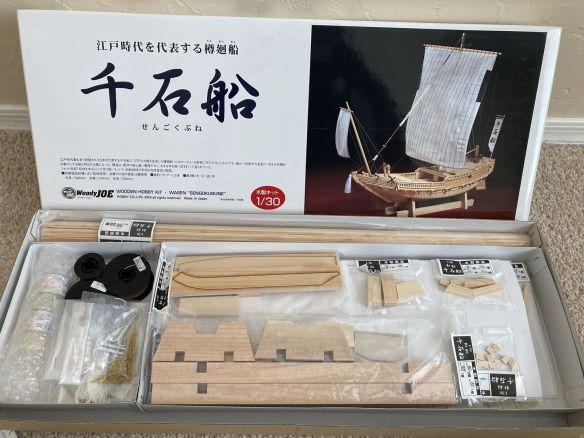I was recently alerted by Glenn Schuster that there is currently an Ebay auction for an old Woody Joe kit from the days before laser cutting, where all parts were still made from milled wood. The kit is a Edo period Japanese coastal transport similar to their current Higaki kaisen and Kitamaebune offerings and goes by the common name for these ships, Sengokubune or 千石船, as it is written in Japanese.