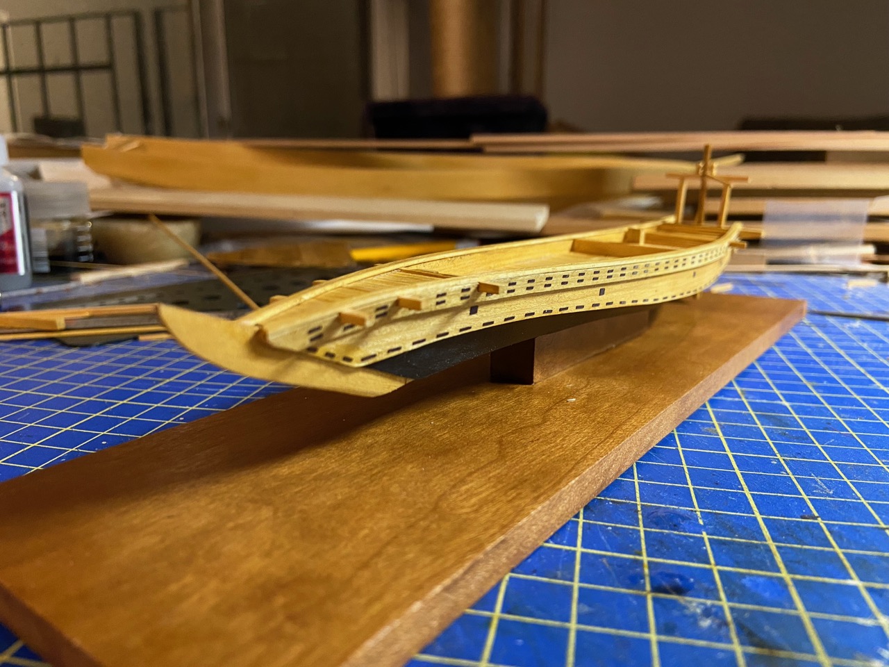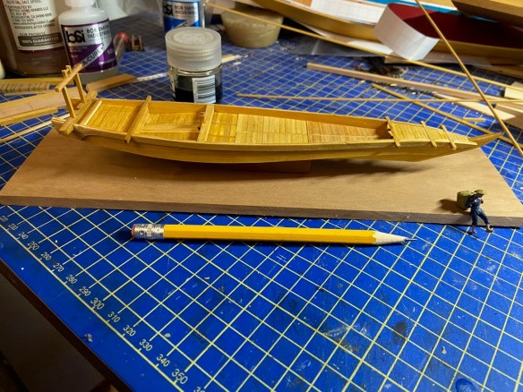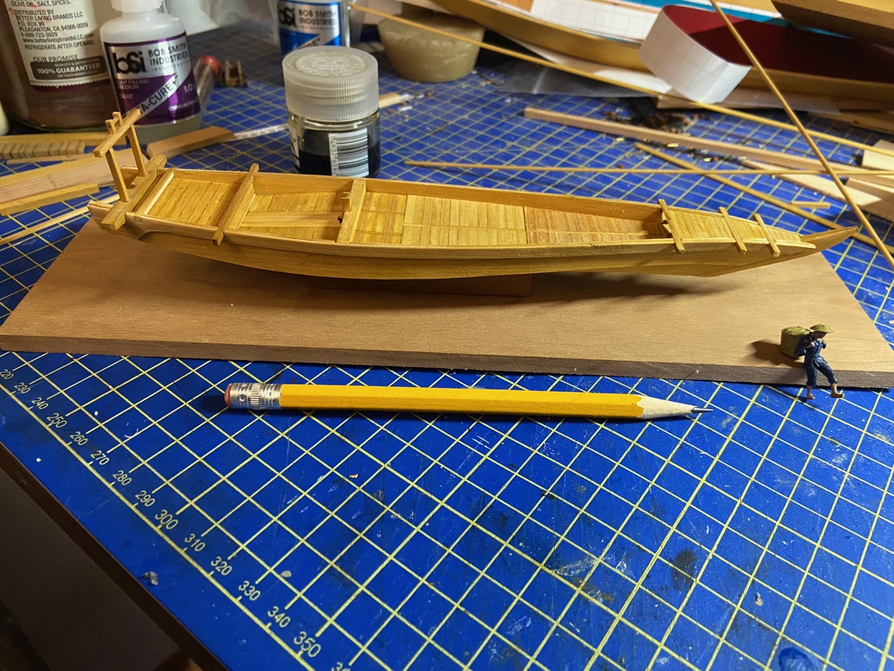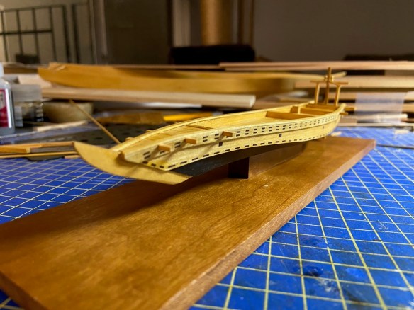 I’m ready to add the uwakoberi, which is the term for the cap rail, but first I need to add the boards that cover the aft end of the hull planking. I don’t know if this is a universal term, but I know these as chiri. They are decorative, but also protect the end grain of the hull planks.