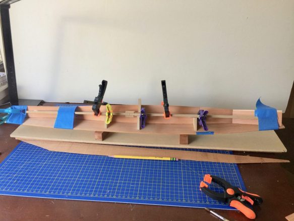 With the hull planks, locally called hoteita (ho-tey-ee-tah), glued into place, the bottom edges of the hull planks were easy to trim, as they just had to be flush with the bottom. For the top edge, I had some measurements to go by, and I used thin strips of wood to use as battens, clamping them into place along the inside of the hull. The top edges of the battens marked the top edges of the hull planks.