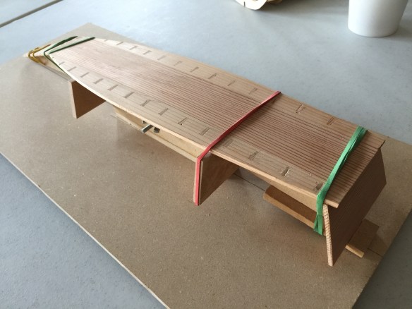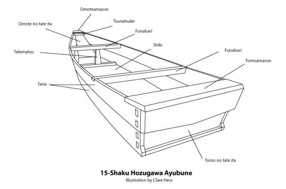 First, I notched out the hull for the bow platform, called the omoteamaose, and the stern platform, called the tomoamaose. These were the easiest to deal with, since they are at the ends of the boat. So, I dealt with these first.