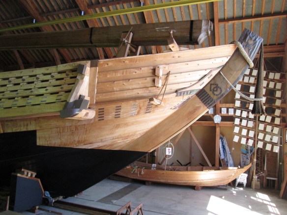 Bow of the Hakusan Maru on Sado Island showing lots of small copper plates on the real ship.