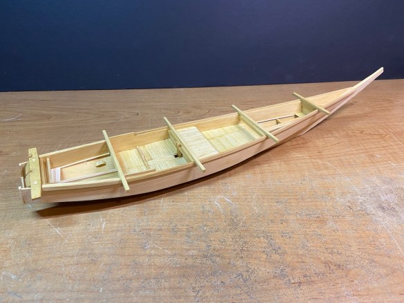 As I mentioned, progress is being made, but it’s basically all in the details now. You may have already noticed the ōtoko, the heavy beam at the stern. This serves as the rudder mount and hinge, and has a rogui (hinge pin and resting pad) on the left or port side for mounting a sculling oar. This boat was set up for up to five sculling oars, with the rogui mounted on the ends of two beam that I have yet to add.