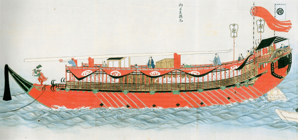 This kind of small galley belonged to the Taikun [ “Great Prince,” the Shōgun Tokugawa]. The construction of extreme lightness is very careful and the method of assembly of parts is the same as that of other boats with a single layer of planks. The stern differs in that it is closed by a panel [false transom], and it has bulwarks raised at the back. The beams are in pairs and placed one on top of the other the lowest one carries the joists, on which rest the deck planks.