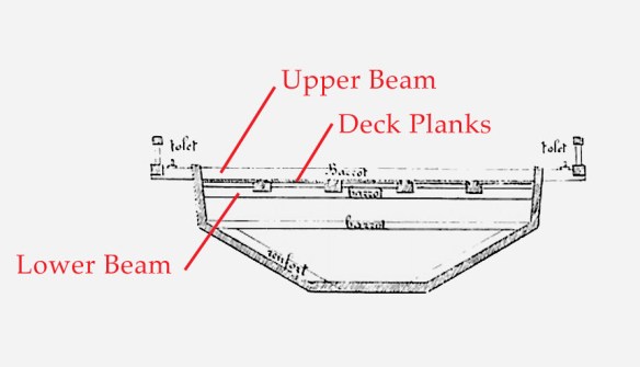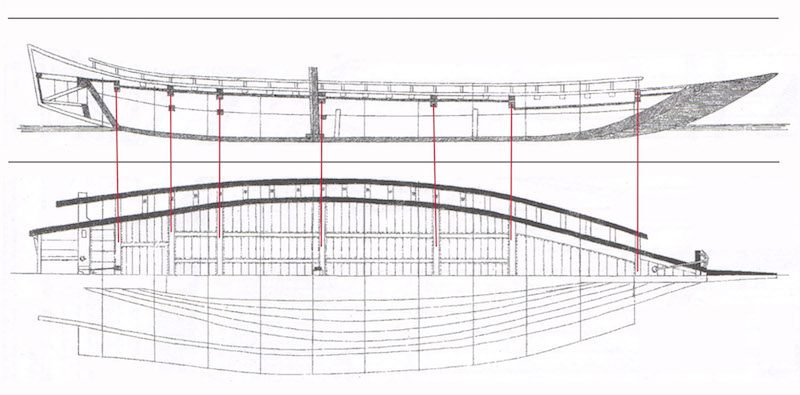 The upper beam protrudes and carries the galleries, which are supported by the beams. Between these are short hanging beams mounting the oars like aboard the great galleys [sailing ship], but at their short length, only one rower is on each oar.