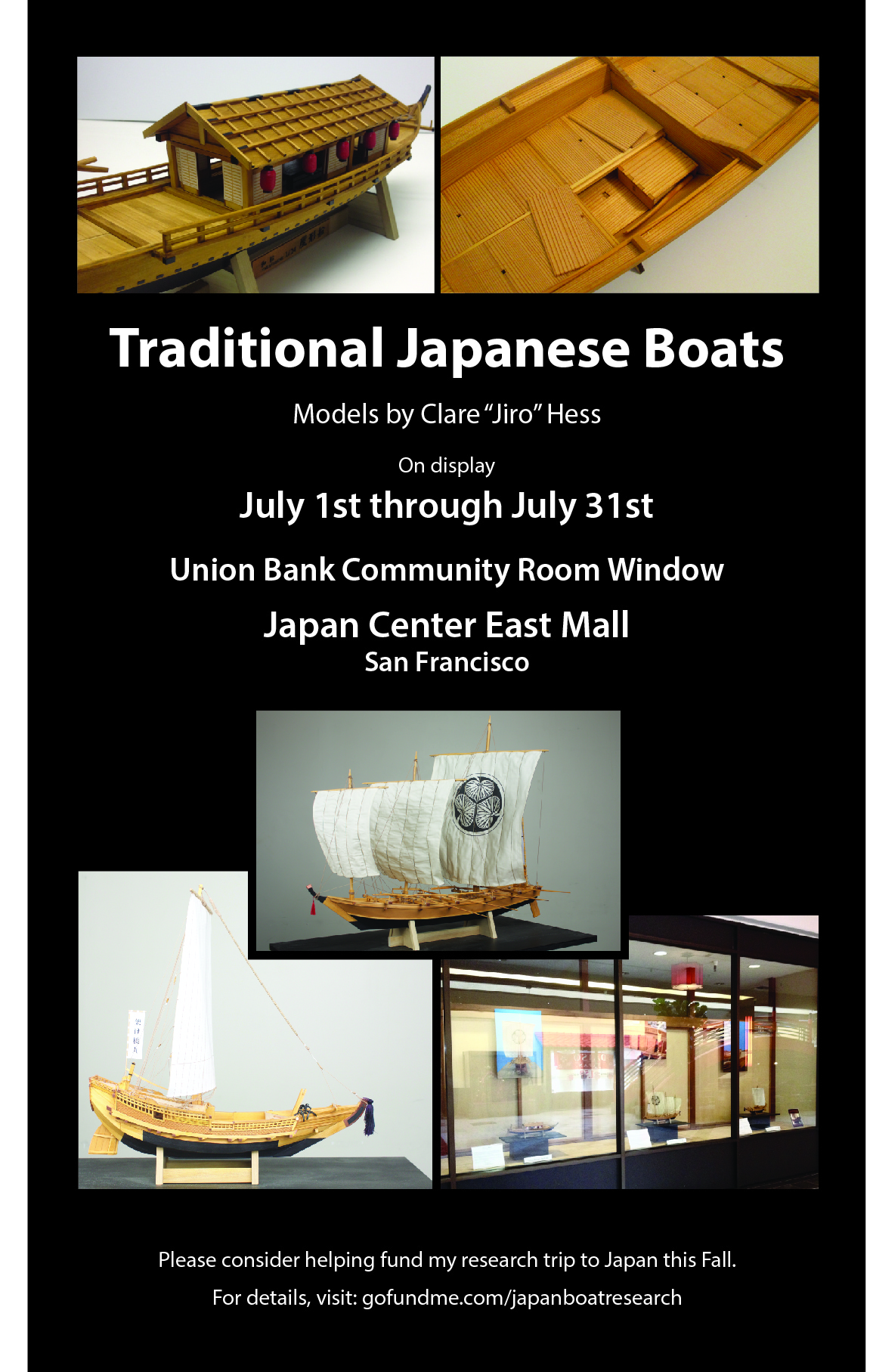 Since I’m doing some fundraising to go to Japan this Fall to do some more first-hand research on Japanese watercraft (don’t forget to check out my gofundme page), I’m taking the opportunity to really get some attention for this display. As with those people involved in the fine arts, I’ve made up an announcement card that I’m having printed up that I will be sending to various friends and people that I think will be interested in it and possibly interested in helping me out (as well as those who have already done so). In addition, I’ve made a simple email announcement photo that I’ve been sending to people.